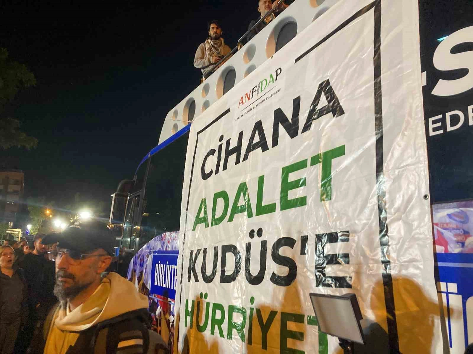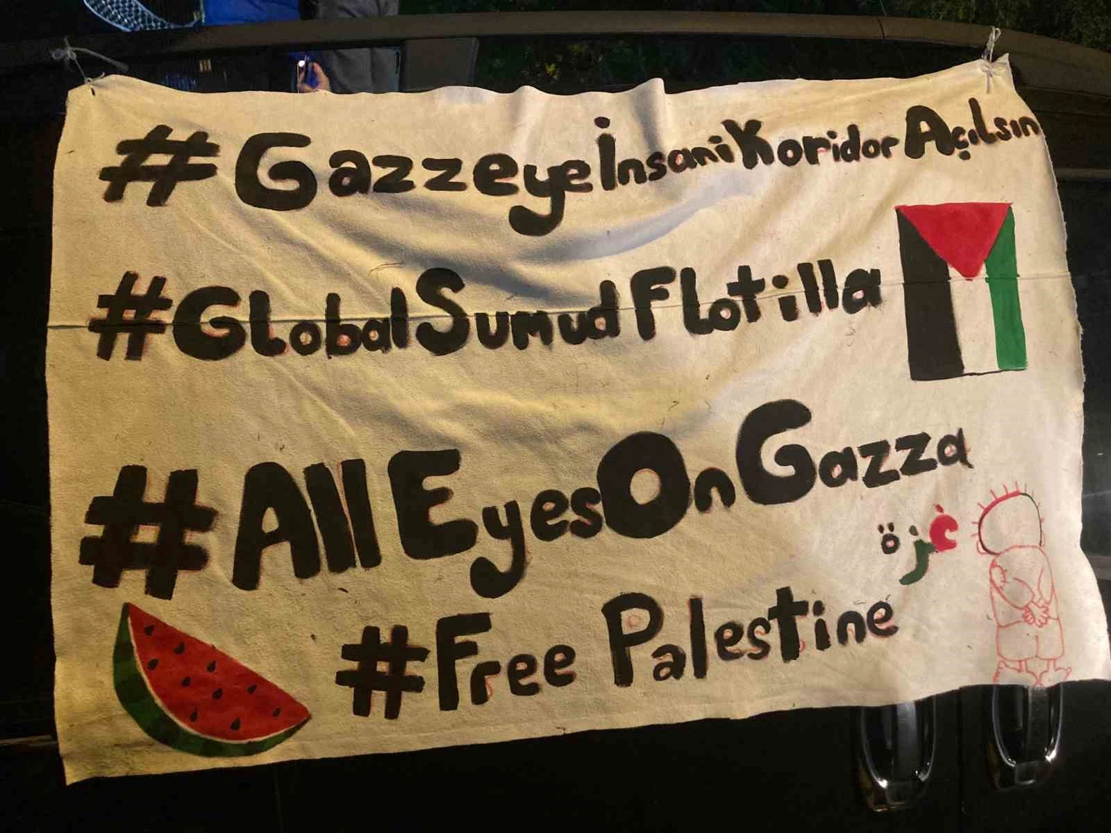 Eylemde Filistin bayrakları açıldı, ayrıca Sumud Filosuna destek amaçlı sloganlar atıldı.