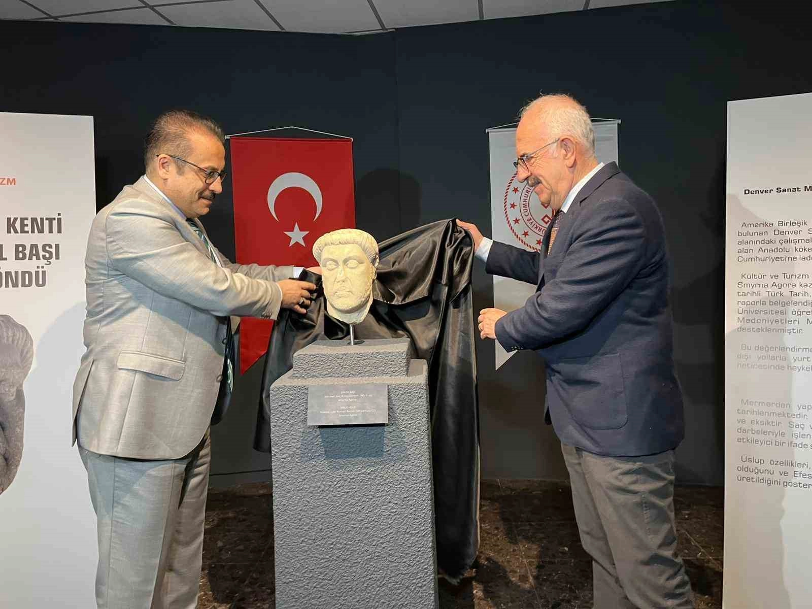 Kültür ve Turizm Bakanlığının yürüttüğü diplomatik çalışmalar sonucu ABD’nin Denver kentinden Türkiye’ye iade edilen ve M.S. 5. yüzyıla tarihlendirilen Smyrna Antik Kenti kökenli mermer heykel başı, İzmir Arkeoloji Müzesinde düzenlenen törenle sergilenmeye başlandı.
