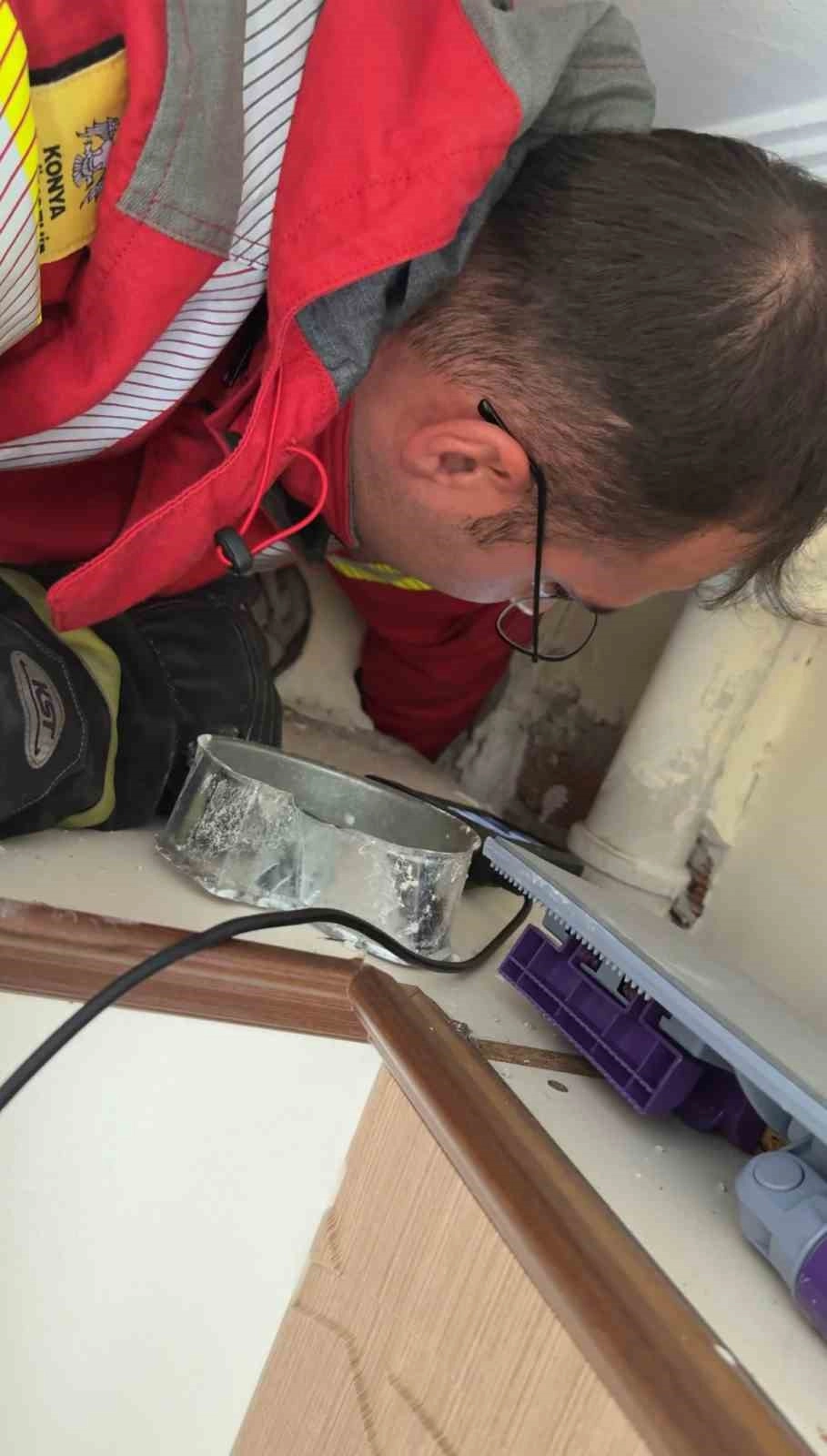 Kedi sesini duyan vatandaşların ihbarı üzerine adrese Konya Büyükşehir Belediyesi İtfaiyesi ekipleri sevk edildi.