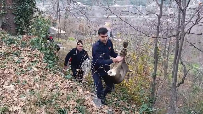Havuza merdivenle inen itfaiye ekipleri, karacayı tutup ayaklarını iple bağlayarak yukarı çıkardı.