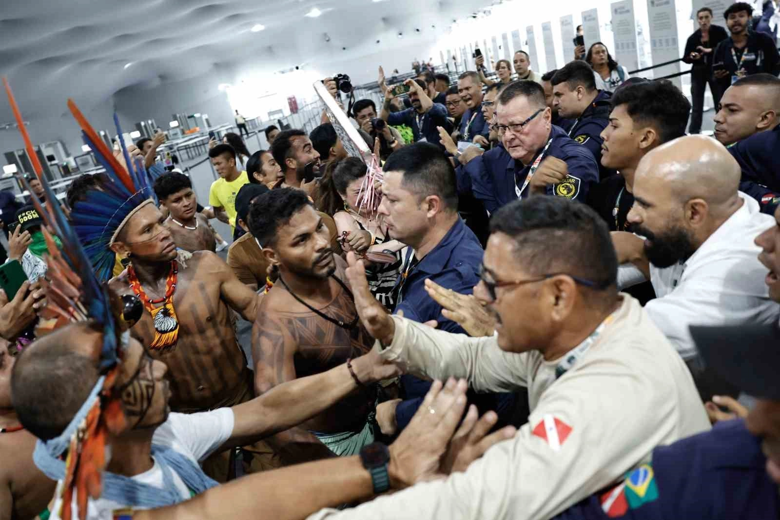 Yerel kıyafetler de giymiş olan protestocular, Belem’de düzenlenen Birleşmiş Milletler (BM) İklim Değişikliği Çerçeve Sözleşmesi 30. Taraflar Konferansı’nın (COP30) zirve alanına geldi.