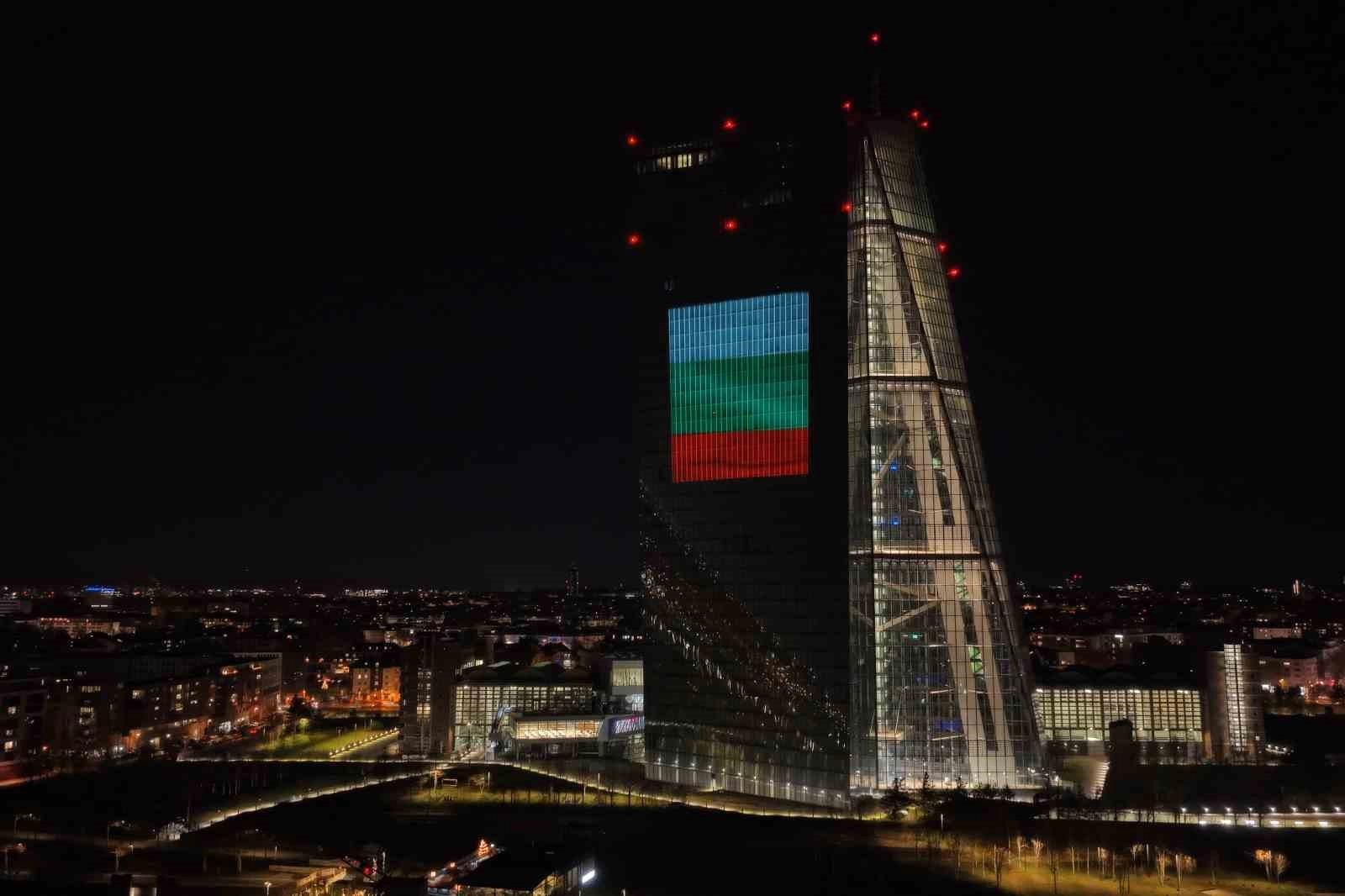 Avrupa Merkez Bankası’nın Frankfurt’taki ana binası da Bulgaristan’ın euro’ya geçişi nedeniyle Bulgaristan bayrağı ile ışıklandırıldı