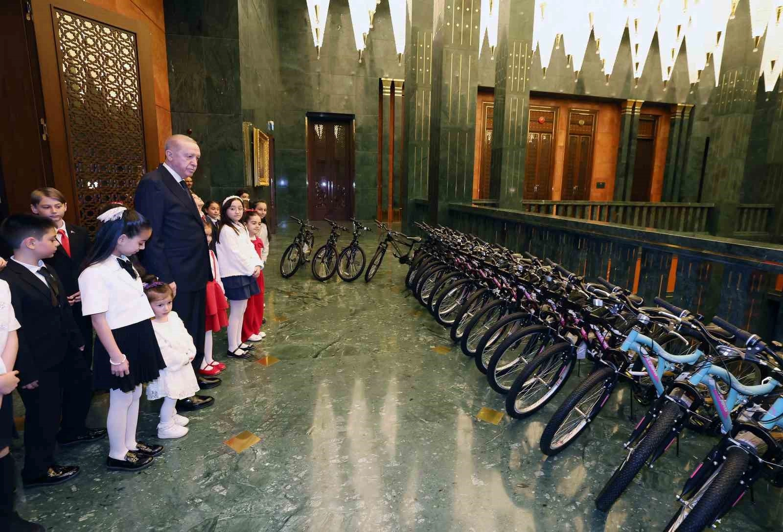 Konuşmasının ardından Cumhurbaşkanı Erdoğan çocuklara bisiklet hediye ederek, onlarla fotoğraf çektirdi.