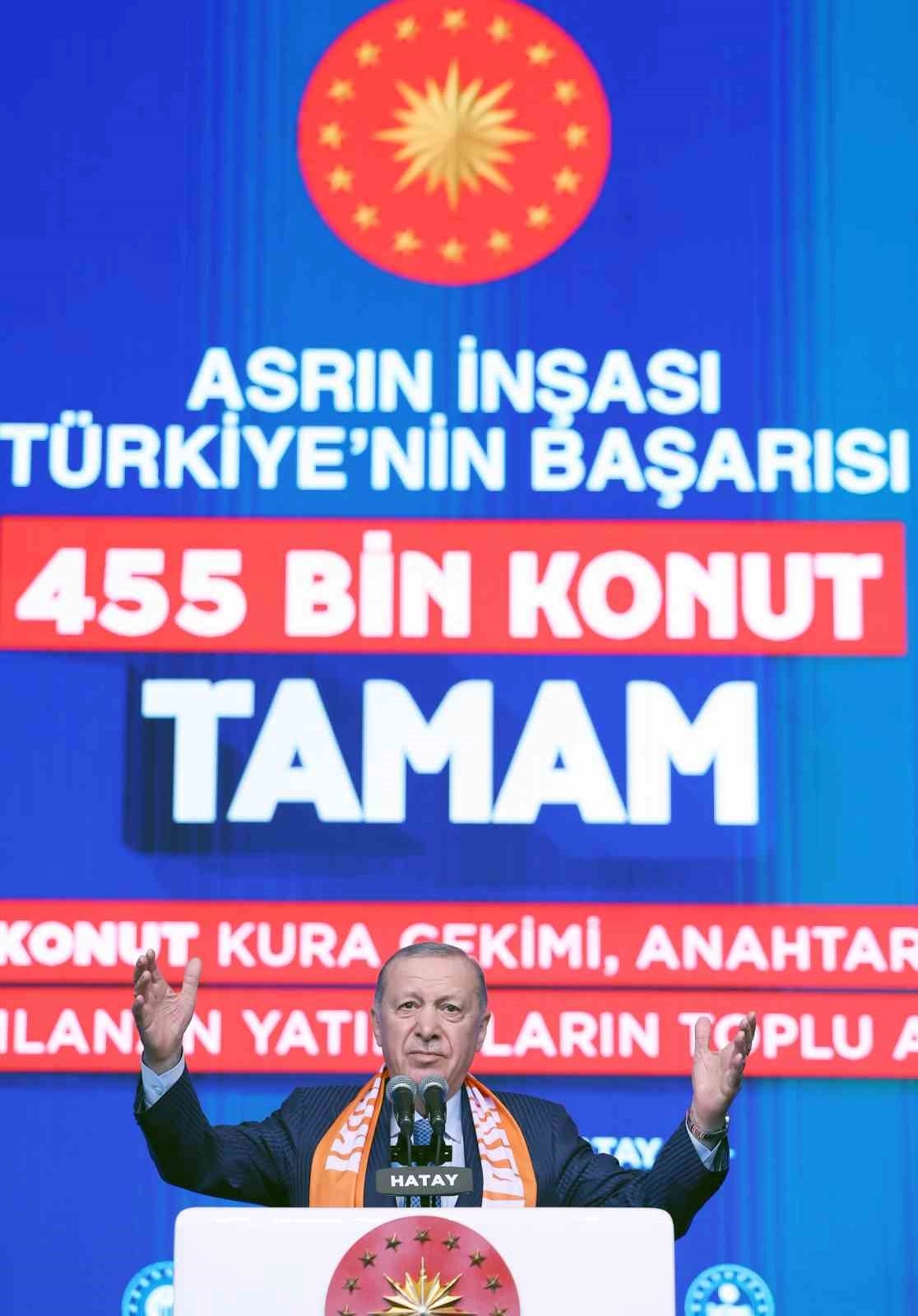 Cumhurbaşkanı Recep Tayyip Erdoğan 455 bininci konutu teslim etmenin gururunu yaşadıklarını ifade ederek, "İşte bugün dünyada hemen hiçbir ülkenin altından kalkamayacağı büyük bir başarıya Hatay’ımızda bizzat tanıklık ediyoruz. Depremin vurduğu on bir ilimizde yapımı tamamlanan 455 bininci afet konutumuzu hak sahibi kardeşlerimize teslim etmenin gururunu yaşıyoruz. Bu yuvalarda yepyeni bir hayatın sayfasını açacak tüm vatandaşlarımıza hayırlı, uğurlu olsun diyor, hanelerine kavuşan her bir kardeşime sağlıklı, mutlu, bereketli ömürler diliyorum. Rabb’im bu evlerde inşallah ağız tadıyla oturmayı nasip eylesin" şeklinde konuştu.