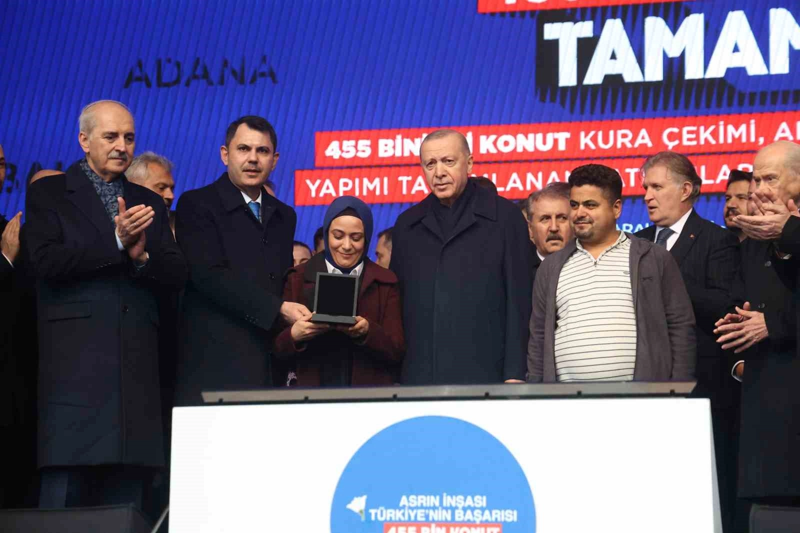 Cumhurbaşkanı Recep Tayyip Erdoğan, Hatay’ın Antakya ilçesinde 455 bininci afet konutu teslim törenine katıldı.