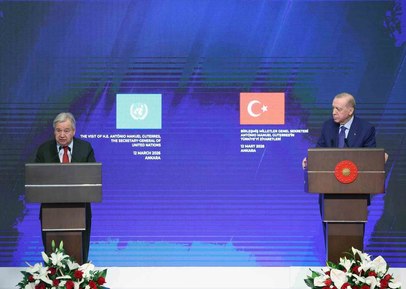 Genel Sekreter Guterres’in gelecek nesillere yaşanabilir bir dünya bırakma hedefi için büyük bir özveriyle çalıştığına şahit olduğunu dile getiren Erdoğan, "Bu vesileyle kendilerinin bilhassa iklim değişikliğiyle mücadele alanında başlattığı girişimlerin önemini vurgulamak istiyorum. Türkiye olarak bu çalışmalara katkıda bulunma hedefiyle Kasım 2026’da Birleşmiş Milletler İklim Değişikliği Çerçeve Sözleşmesi 31’inci Taraflar Konferansı’na ev sahipliği yapmaya hazırlanıyoruz. Eşim Emine Erdoğan’ın öncülüğünde 2017 yılında başlattığımız Sıfır Atık Projesi’nin küresel bir girişime dönüşmesini sağlayan, Birleşmiş Milletler sürecinde desteğini esirgemeyen ve Küresel Sıfır Atık İyi Niyet Beyanı’nın ilk imzacılarından olan Sayın Guterres’e bir kez daha teşekkürlerimi iletiyorum. İstanbul’u bir Birleşmiş Milletler merkezi haline getirme vizyonumuz doğrultusunda teşkilatın ofislerini aynı çatı altında toplayacak Birleşmiş Milletler Evi projemizi hayata geçirmeye hazır haldeyiz. Bu projenin Sayın Genel Sekreter’in Birleşmiş Milletler 80 girişimine de ulusal düzeyde önemli katkı sunacağını düşünüyorum" ifadelerini kullandı.