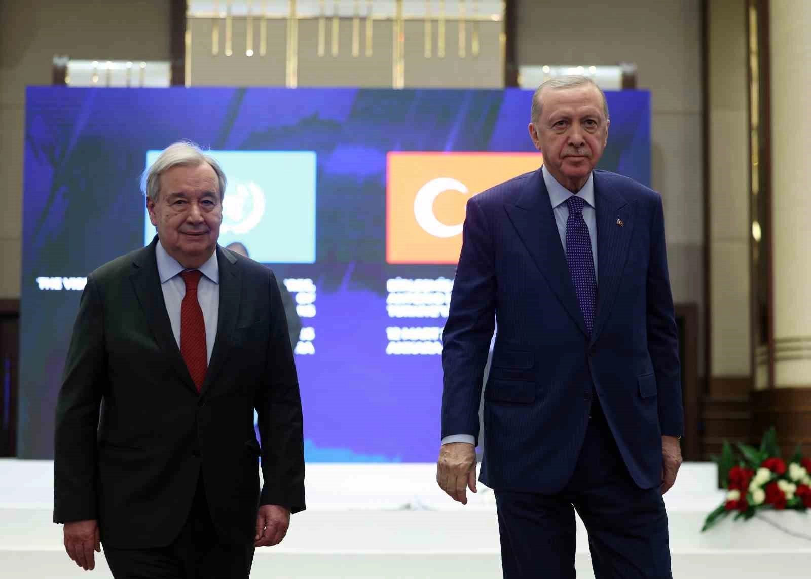 BM Genel Sekreteri Guterres’in görevi sırasında Türkiye’nin Birleşmiş Milletler çatısı altındaki katkılarını her alanda güçlendirdiklerini ifade eden Cumhurbaşkanı Erdoğan, "Aradan geçen 10 yılda Sayın Genel Sekreterle gerek bölgemizde gerek dünyada barışı tehdit eden meseleler konusunda yakın diyalog içerisinde olduk. Bu istişare ve çabalarımızın bazen en zorlu şartlarda dahi sonuç verdiğini de memnuniyetle gördük. Sayın Guterres’le birlikte yoğun çaba sarf ettiğimiz Karadeniz Tahıl Girişimi bu sayede küresel bir gıda krizinin önüne geçmeyi başardık. Ukrayna’da barışın yeniden inşasına ve savaşın sonlandırılmasına yönelik çabalarda Birleşmiş Milletlerle yakın iş birliğimizi devam ettiriyoruz. Diplomasi ve diyalog adil ve kalıcı bir barışa giden en güvenli yoldur. Dolayısıyla bölgemizin bir ateş çemberine döndüğü bu zor günlerde Sayın Genel Sekreterin diplomasi ve diyalog çağrılarını bu bakımdan çok değerli bulduğumu vurgulamak istiyorum" ifadelerini kullandı.