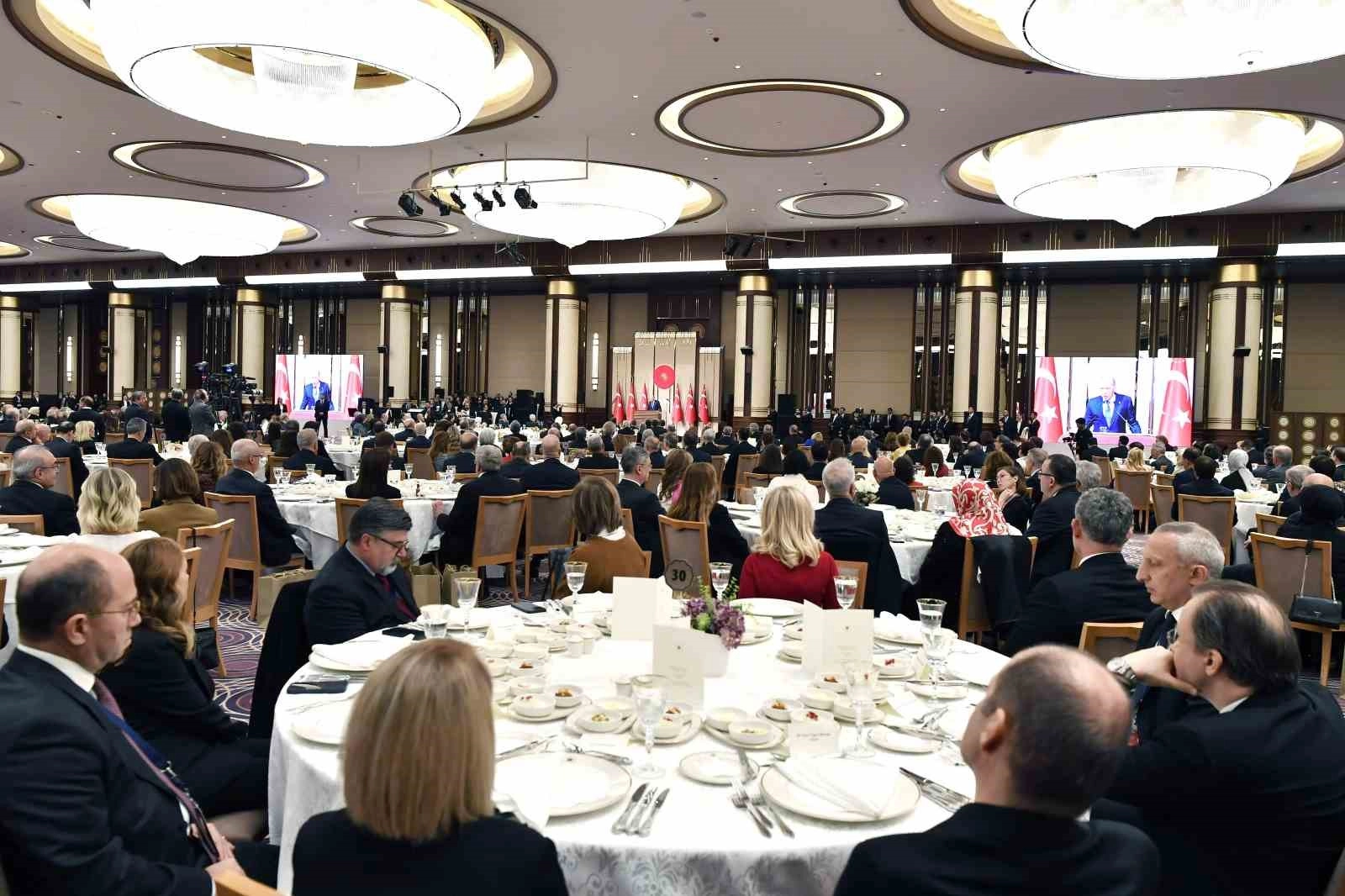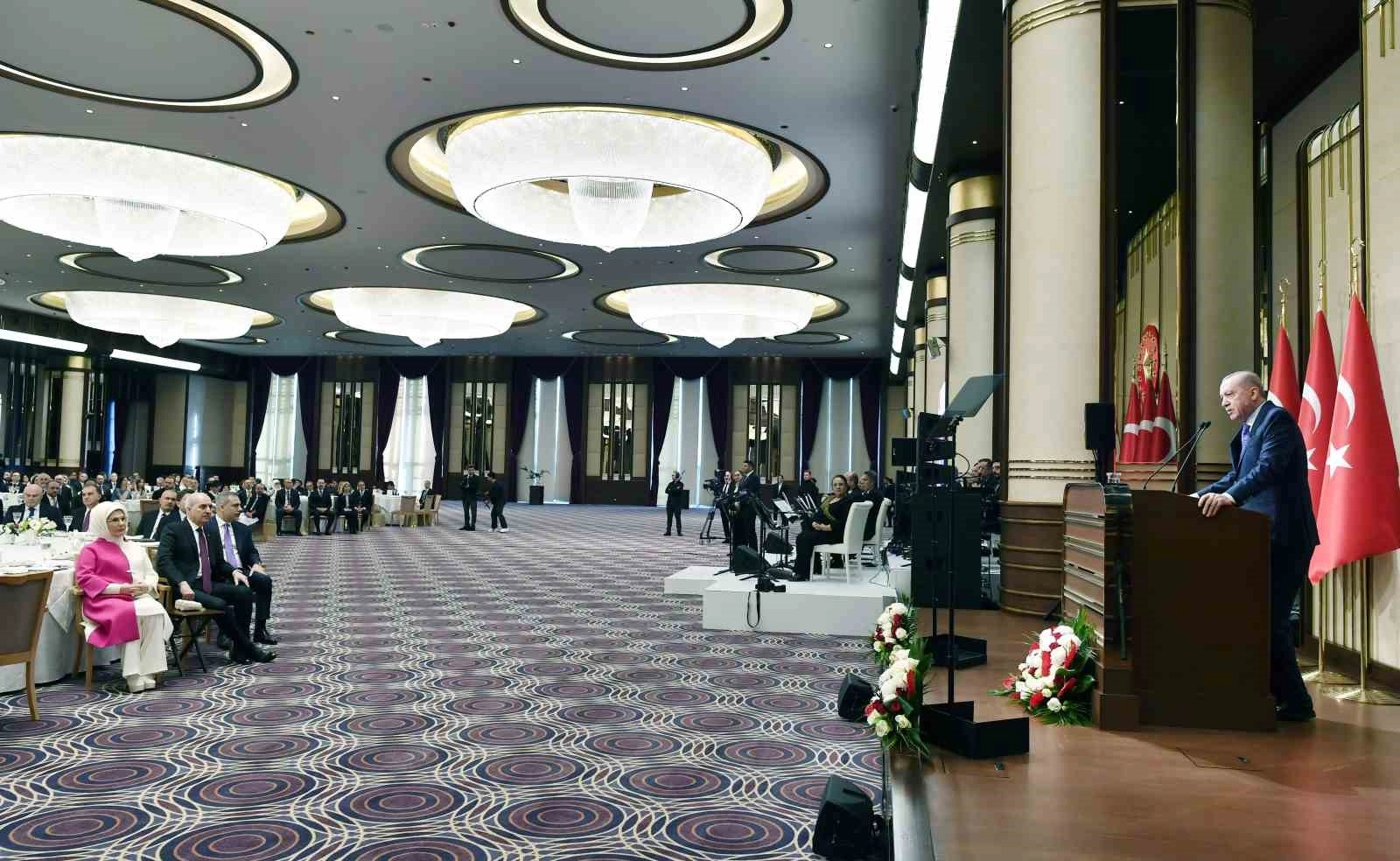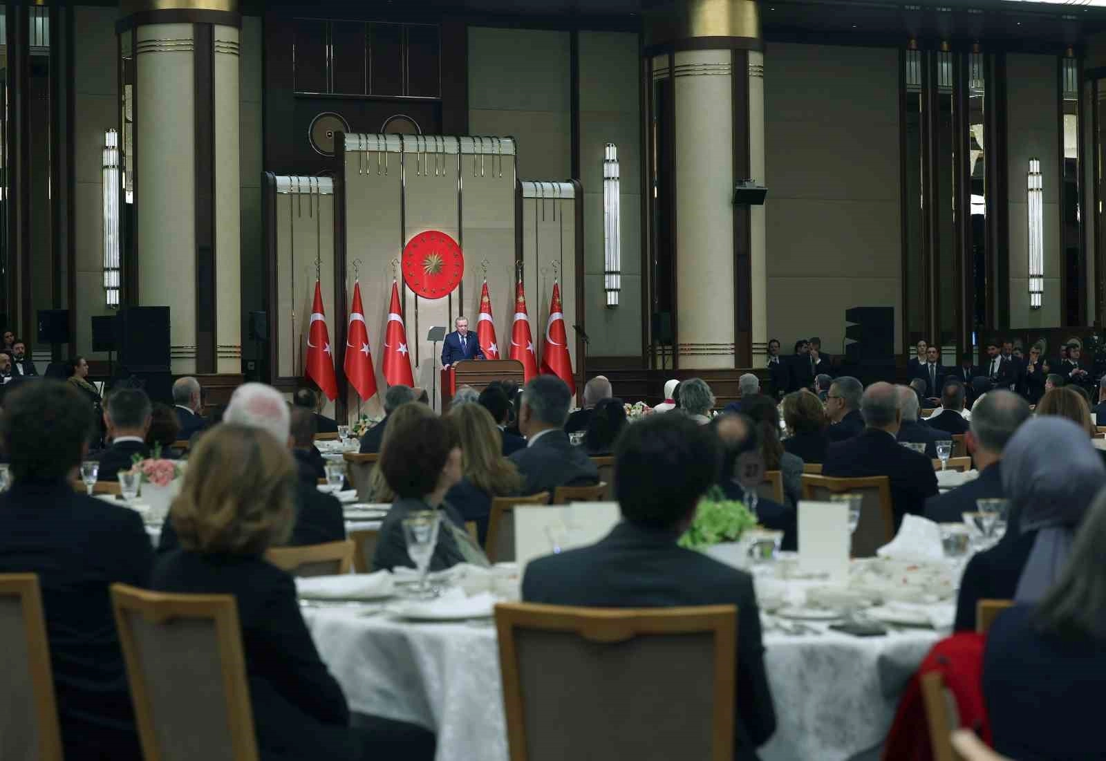 Hariciye Teşkilatı’nın mesuliyetlerini hakkıyla yerine getirebilmesi için eylül ayında yeni yerleşkesinin temellerini attıklarını kaydeden Erdoğan, "Dışişleri Bakanlığımızın yeni binasının, devletimizin köklü diplomasi geleneğini, gelecek vizyonunu ve milletimizin güçlü iradesini yansıtacak bir eser olacağına yürekten inanıyorum. Elbette bunları sizlerden beklerken biz de boş durmuyor, Türkiye’yi en güzel yerlere taşımak için gece gündüz demeden çalışıyoruz" şeklinde konuştu.
