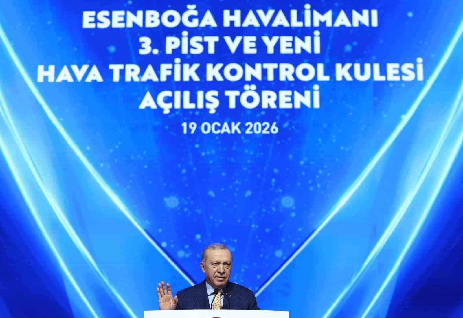 Esenboğa Havalimanında da son 23 yılda önemli bir büyüme sağladıklarını söyleyen Cumhurbaşkanı Erdoğan, "2002’de 37 bin 421 uçak ve 2 milyon 836 bin yolcu trafiği gerçekleşen Esenboğa’da 2024 yılında uçak trafiği yüzde 159 artışla 96 bin 910’a, yolcu trafiği ise yüzde 355 artışla 12 milyon 913 bin 753’e ulaştı. 2025’te ise uçak trafiği bir önceki yıla göre yüzde 7 artarak 103 bin 928’e, yolcu trafiği de yüzde 8 artışla 13 milyon 987 bin 298’e yükseldi. Esenboğa’daki yolcu trafiğinin 2035’te 23,1milyonu, 2045’te 31,5 milyonu aşacağını öngörüyoruz. Bu sayılar bize Esenboğa Havalimanımızın artık daha büyük bir kapasiteye, daha yüksek standartlara ihtiyaç duyduğunu gösteriyor. Tam da bu amaçla Esenboğa’yı yenilikçi bir vizyonla geliştirmek üzere kolları sıvadık, çalışmaları başlattık ve hamdolsun bugün iki etaptan oluşan projemizin birinci etabını tamamladık. Uygulamaya aldığımız bu proje kapsamında 75 metre genişliğinde ve 3 bin 750 metre uzunluğundaki 3. pistimizi, 77 metre yüksekliğindeki hava trafik kontrol merkezimizi ve 13 bin 500 metrekare büyüklüğündeki teknik bloğu inşa ettik. Ayrıca, 85 bin metrekarelik 6 adet uçak park kapasiteli yeni kargo apronumuzu ve bunlara bağlı taksi ve servis yolları da dahil 945 bin metrekarelik kaplama sahasının yapımını tamamladık. Ulupınar Deresinin 1,2 kilometrelik kısmını ıslah ettik. 3 adet bağlantı taksi yolu ve 5 adet hızlı çıkış taksi yolunun yanı sıra, uçuş kontrol hangarından gümrük müdürlüğüne, özel maksatlı garajdan yeni itfaiye istasyonuna, ısı merkezi ve su deposundan 15 adet nöbetçi kuleye toplam 41 bin 52 metrekarelik inşaat alanında en son teknolojiye sahip çok sayıda yapıyı inşa ettik. Tüm bunların yanında 1.200 araçlık açık otoparkımızı da Esenboğa Havalimanımıza kazandırdık" açıklamasında bulundu.