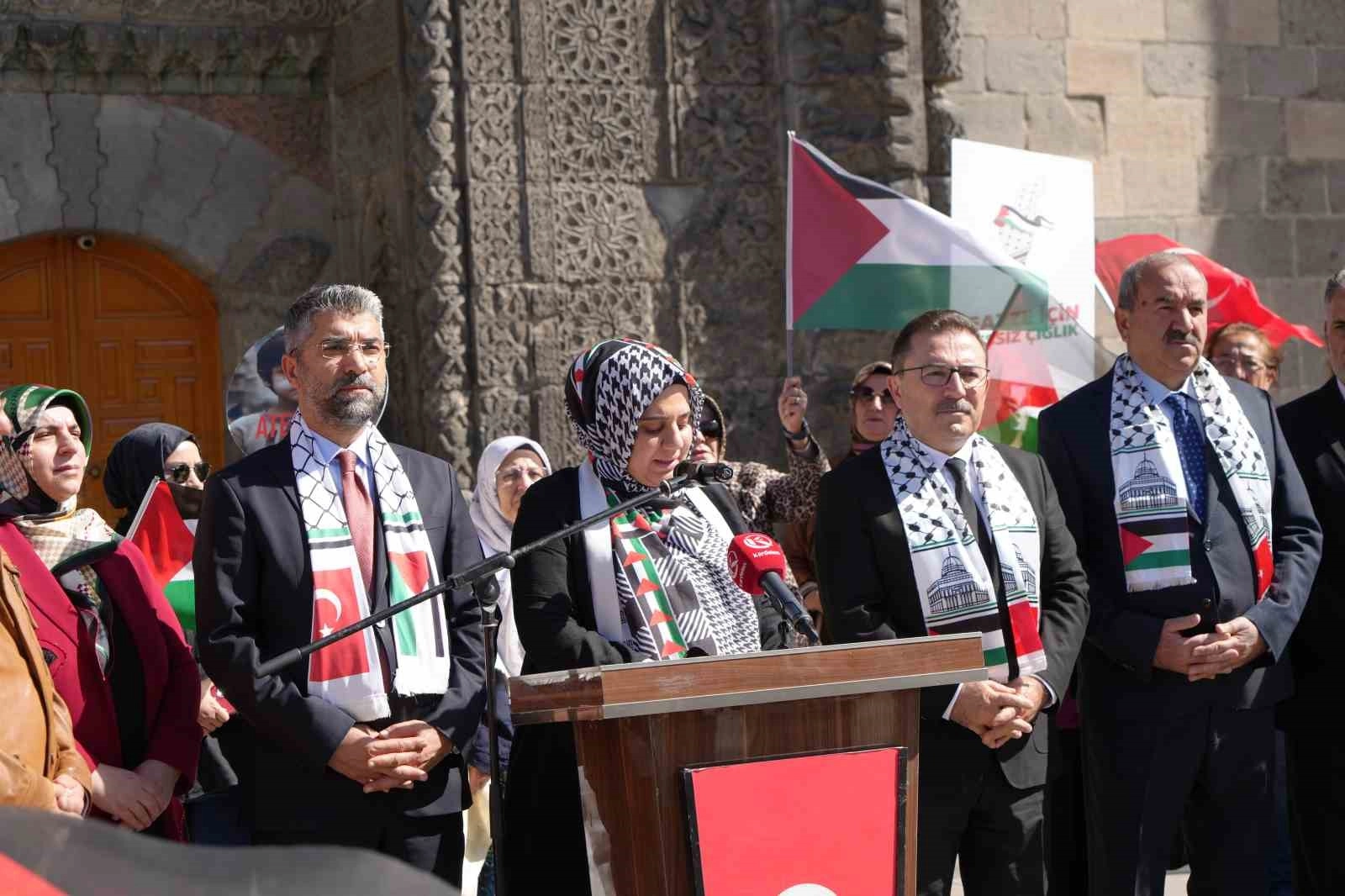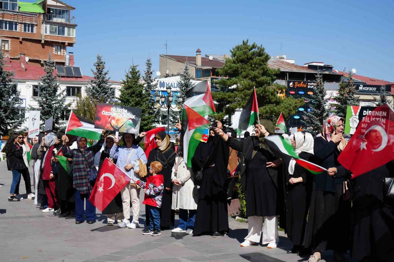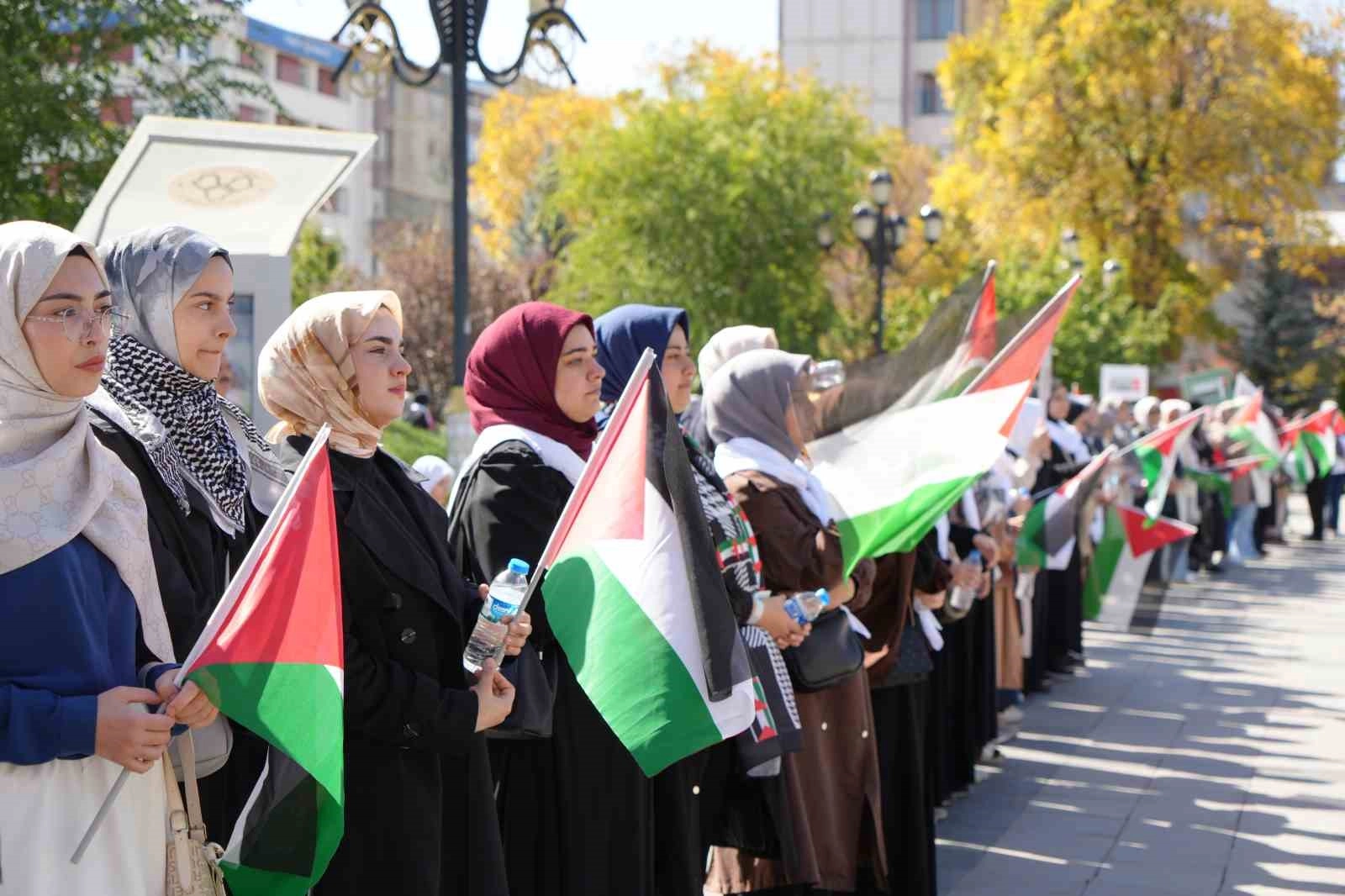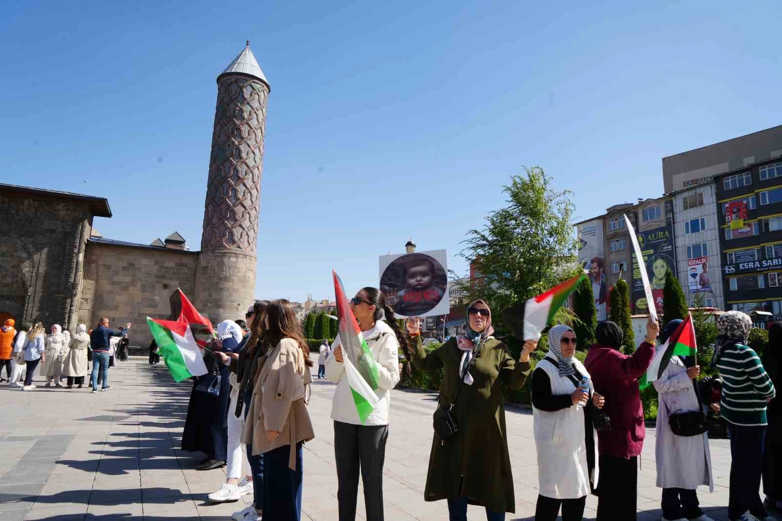 Yakutiye Kent Merkezi’nde toplanan kadınlar el ele tutuşarak, Gazze’ye destek için zincir oluşturdu.