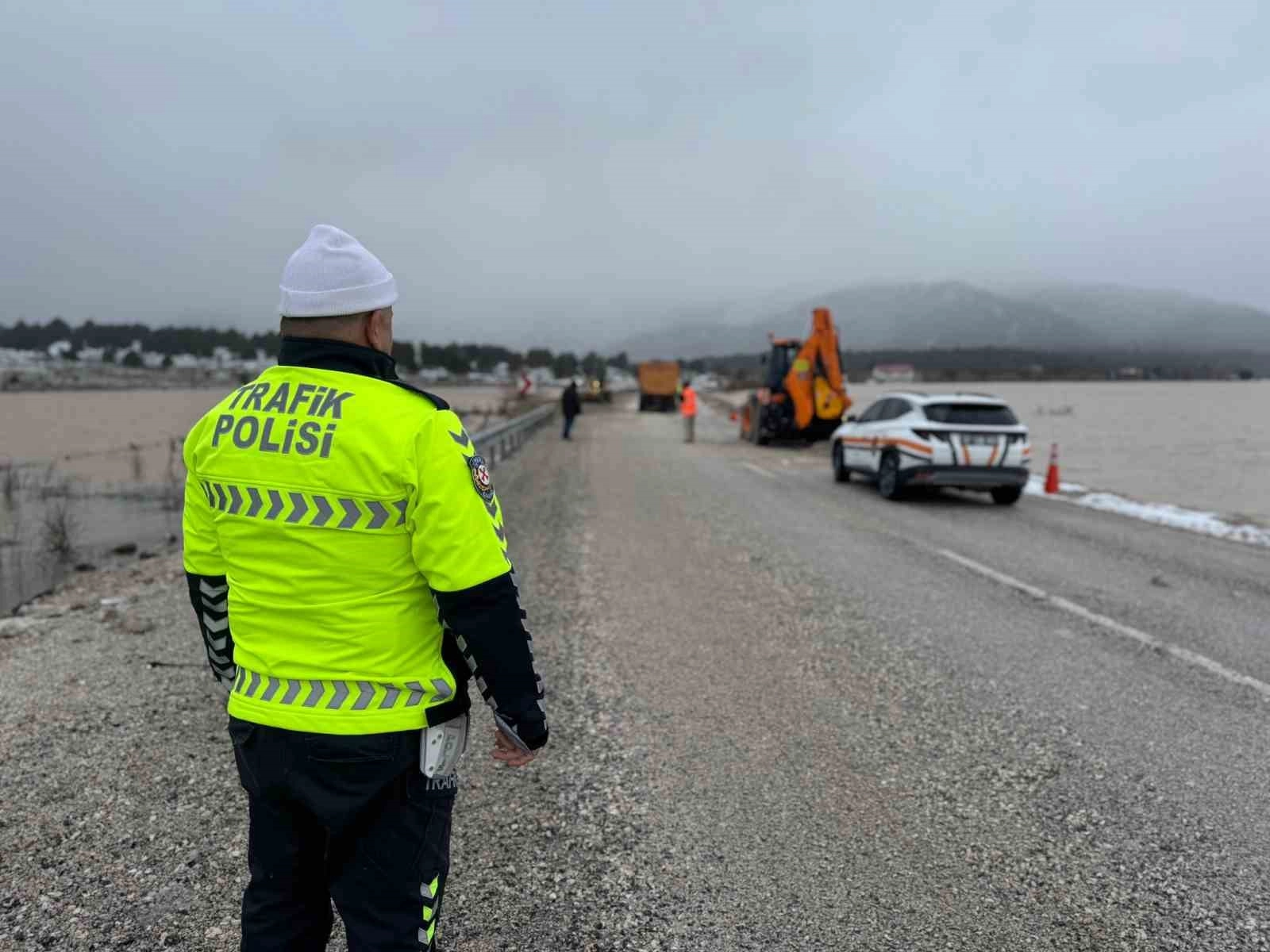 Kara yolu üzerinde bulunan Eşen 1 Baraj Göleti’nde kuvvetli yağışların ardından su seviyesi yükselince, yolun bir noktasında su birikintisi oluştu.