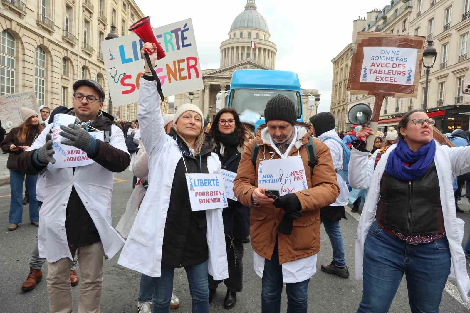 Fransa’da 5 Ocak tarihinde 10 günlük geniş kapsamlı bir grev kararı alan aile hekimleri, 2026 Sosyal Güvenlik Finansman Yasası’nda yer alan düzenlemeleri protesto etmek amacıyla Paris’te büyük bir yürüyüş düzenledi.