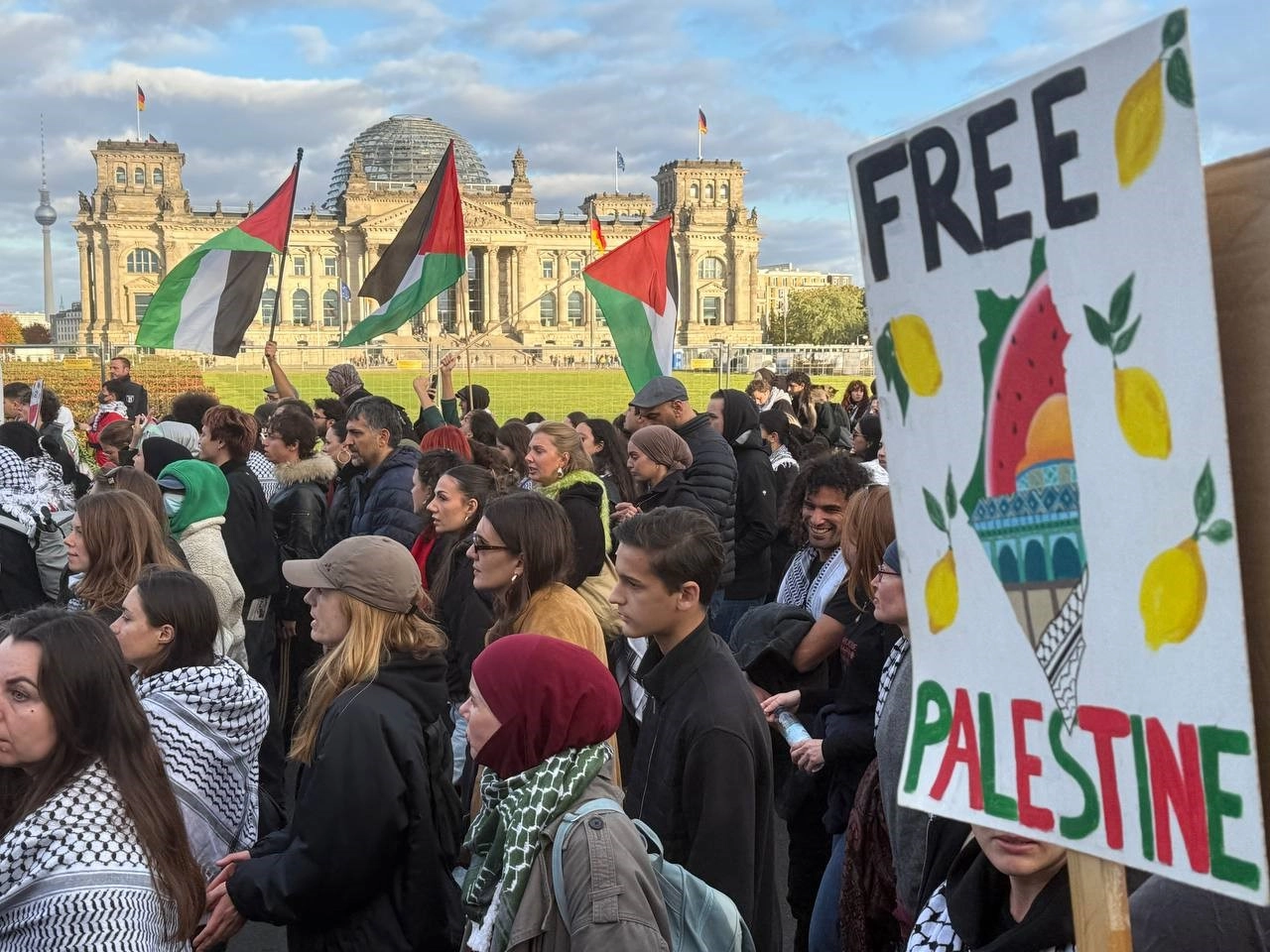 İsrail ile Hamas arasında Gazze’de ateşkese varılmasından sonra Almanya’nın başkenti Berlin’de binlerce kişi Filistin’e destek için buluştu.