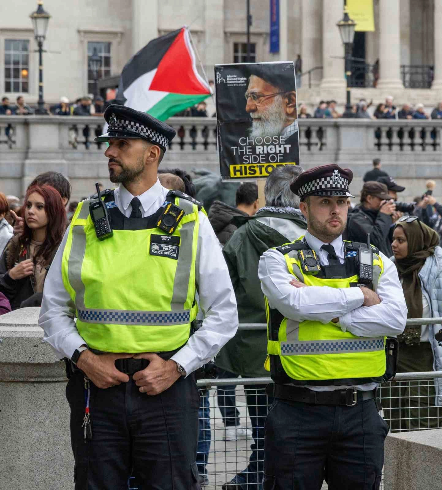 Dün Londra’daki Trafalgar Meydanı ve Westminster Köprüsü’nde bir araya gelen göstericiler, Filistin bayrakları dalgalandırarak, "Savaşı durdurun", "Yasağı kaldırın, suçlamaları kaldırın", "Barış" yazılı pankartlar taşımıştı.