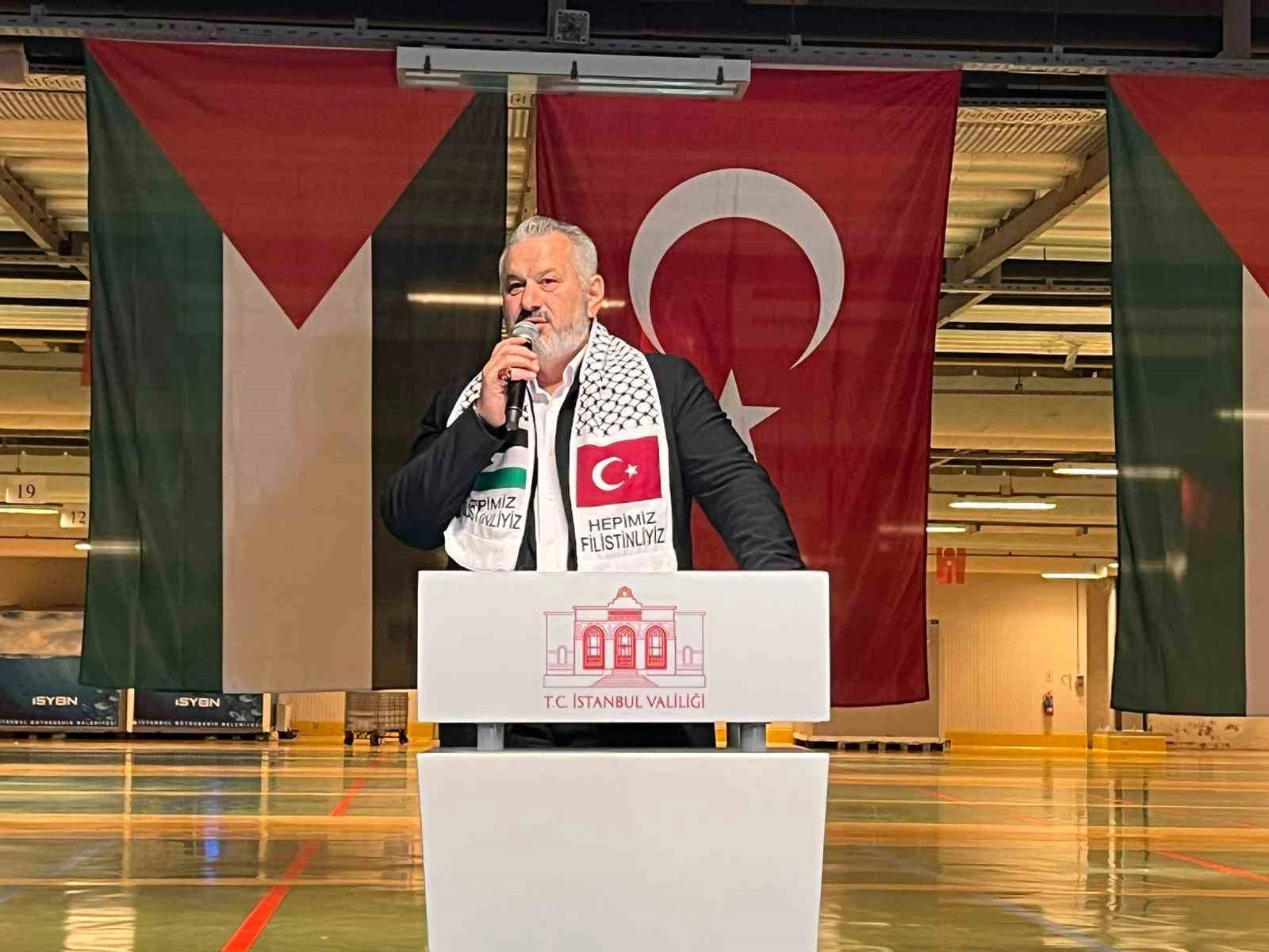 Programda konuşan İstanbul Valisi Davut Gül, "Bu mesele sadece ekonomik imkanlarla 3 lira, 5 lira bir tarafa koymak değil. Safımızı belirlemek. Birlikte hareket etmek. Mazlumların yanında olmak. Zalimin karşısında olmak. Daha da önemlisi bütün farklılıklarımızı bir tarafa bırakarak bu işi birlikte yapmak kıymetli. Geçen hafta içerisinde Esenler Belediyemiz yapmıştı. 15 bin 700 esnaf var. 15 bin 700 esnafın tamamı bir günlük kazançlarının bir kısmını bu işe ayırdılar. Bir şehrin tamamen bir konuda birlikte hareket etmesi çok görülen bir şey değil. Ama öyle bir zulüm var ki. Öyle bir zalimlik var ki. Öyle bir soykırım var ki. Zerre kadar kalbinde vicdanı olan, zerre kadar merhameti olan bir insanın böyle davranmama ihtimali yok. Dini, dili, ırkı, mezhebi ne olursa olsun. Bu başka bir şey. Dünya tarihi birçok zalimlik görmüştür ama böyle bir zalimlik herhalde çok sayılıdır. Belki bu kadar şiddetlisini görmemiştir. Hepimiz şahitlik ettik. Allahtan duamız, Allah bu zalimliği yapan bu katillerin helak olduğunu da bize göstersin. Türkiye olarak bu anlamda geçmişimiz temiz. Durduğumuz yer temiz. Sayın Cumhurbaşkanımızın liderliğinde dünyanın neresine gidersek gidelim gücümüz nispetinde yanlışa yanlış, doğruya doğru. Zalime zalim, mazluma mazlum diyebilecek durumdayız. Millet olarak da karınca kararınca 7’den 70’e bütün farklılıklarımızı bir kenara bırakarak bunu yapmaya gayret ediyoruz" dedi.