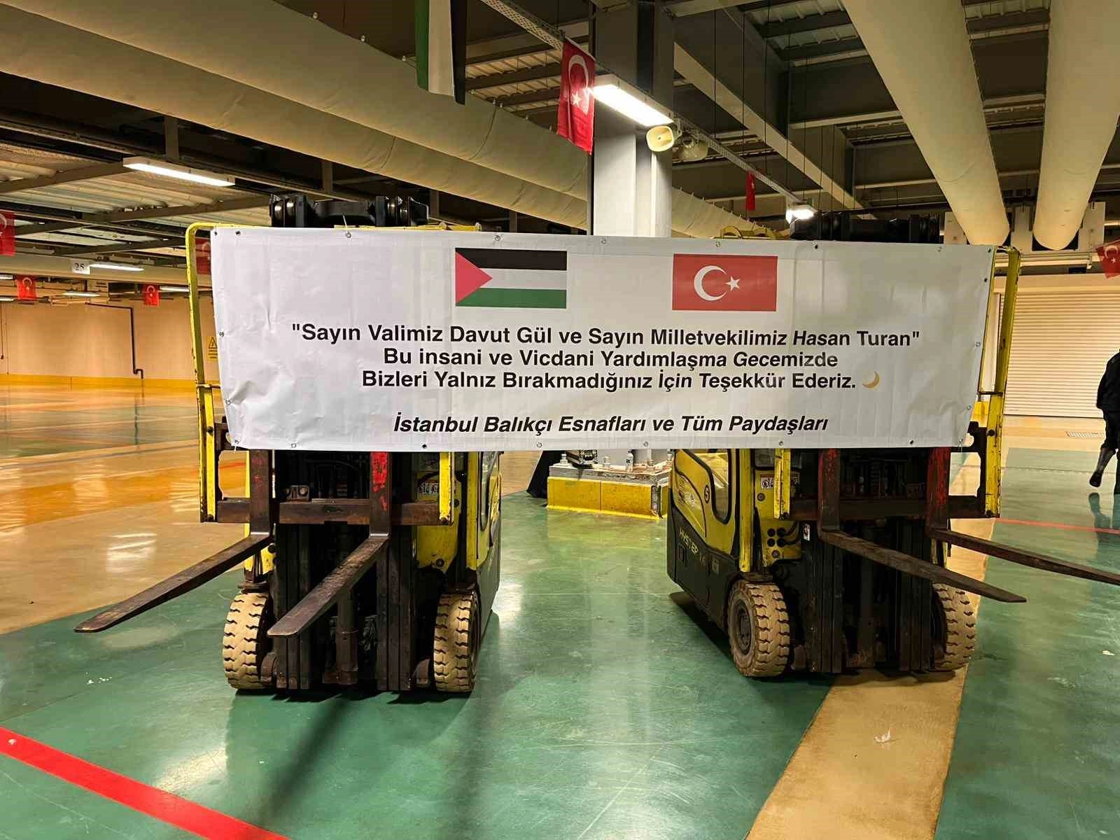 Beylikdüzü’nde Gürpınar Su Ürünleri Hali’nde düzenlenen etkinlikte İstanbullu balıkçılar bir günlük kazançlarını Gazze’ye bağışlayacaklarını açıkladı.