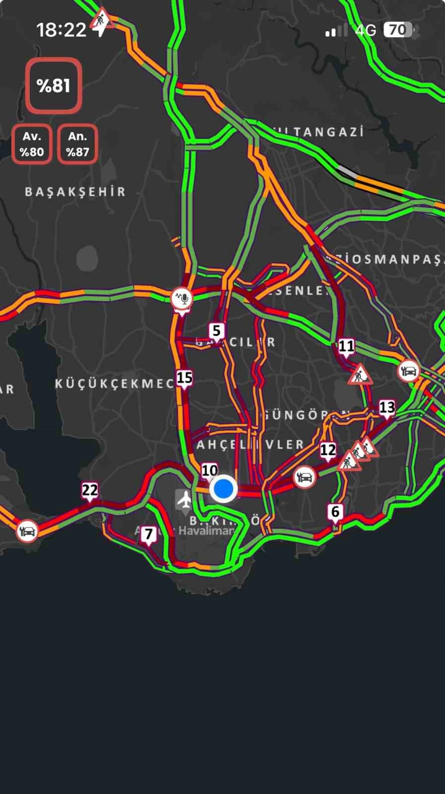 İstanbul’da, mesai bitimiyle trafik yoğunluğu E-5 ve ana arterlerde yüzde 81’e ulaştı.