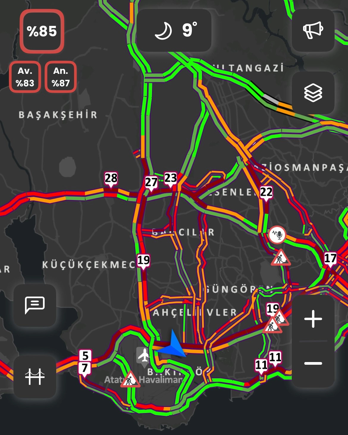 İstanbul Büyükşehir Belediyesi Trafik Yoğunluğu Haritası verilerine göre trafik yoğunluğu saat 18.55 itibariyle yüzde 85 olarak ölçüldü.