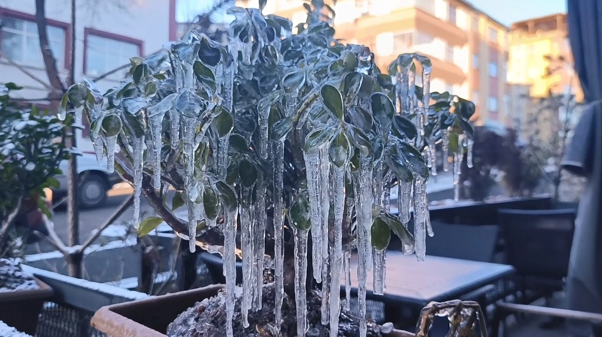 Sibirya soğuklarının etkili olduğu kentte bir iş yerinin kilidi dondu, dükken önündeki süs bitkisinde de sarkıtlar oluştu.