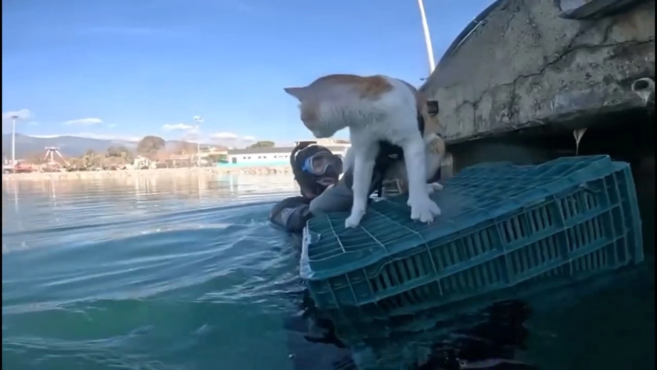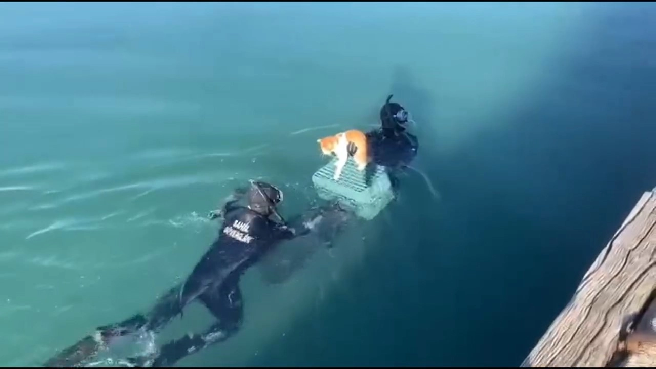 Balık adamlar, korktuğu gözlenen kediyi yanlarında getirdikleri yüzer bir kasa üzerine alarak güvenli bölgeye taşıdı.