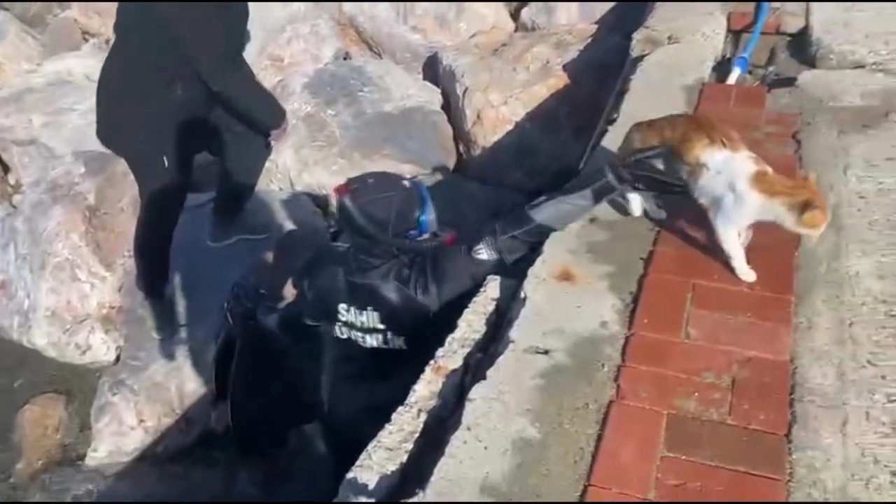 İhbar üzerine bölgeye sevk edilen Sahil Güvenlik Komutanlığı’na bağlı balık adamlar, kediyi kurtarmak için denize girdi. İskelenin altındaki karanlık ve dar bölgede titiz bir çalışma yürüten ekipler, kedinin yerini kısa sürede tespit etti.