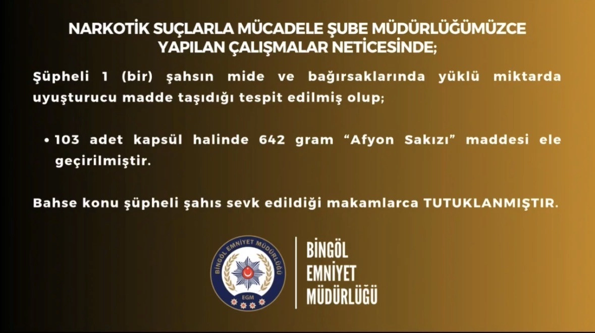 Bingöl’de polis ekiplerince gerçekleştirilen çalışmada, mide ve bağırsaklarında uyuşturucu madde taşıdığı belirlenen şüpheli yakalandı.