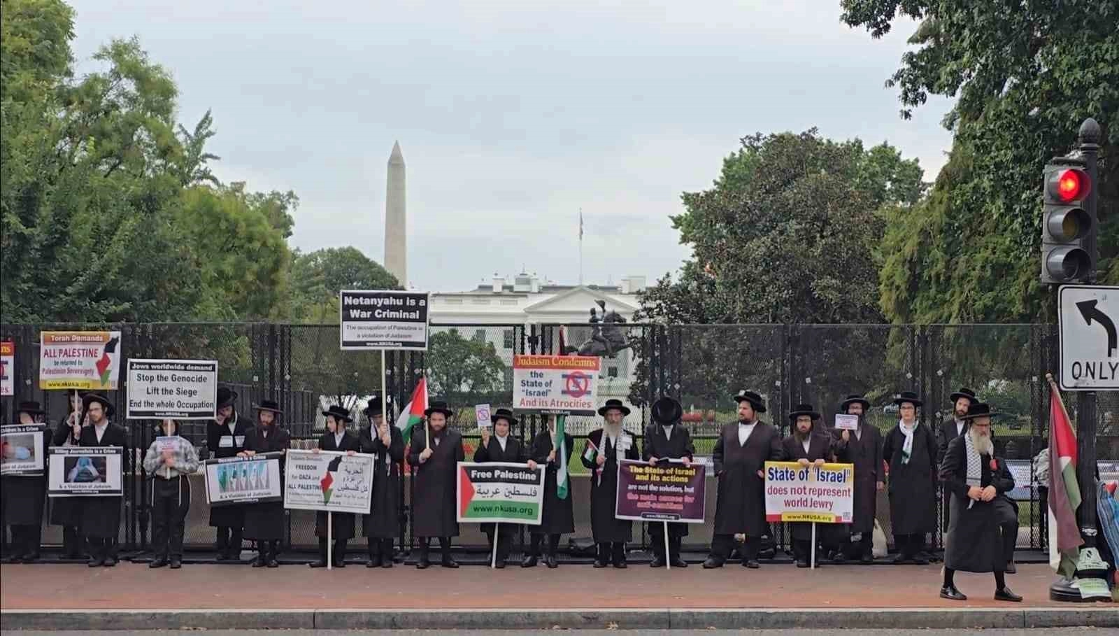 Beyaz Saray önündeki Pennsylvania Caddesi’nde bir araya gelen göstericiler, ellerinde İsrail saldırılarında öldürülen Filistinlilerin ve İsrailli esirlerin fotoğraflarını taşıdı.