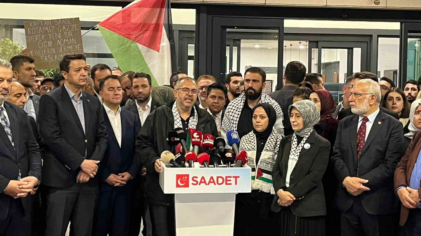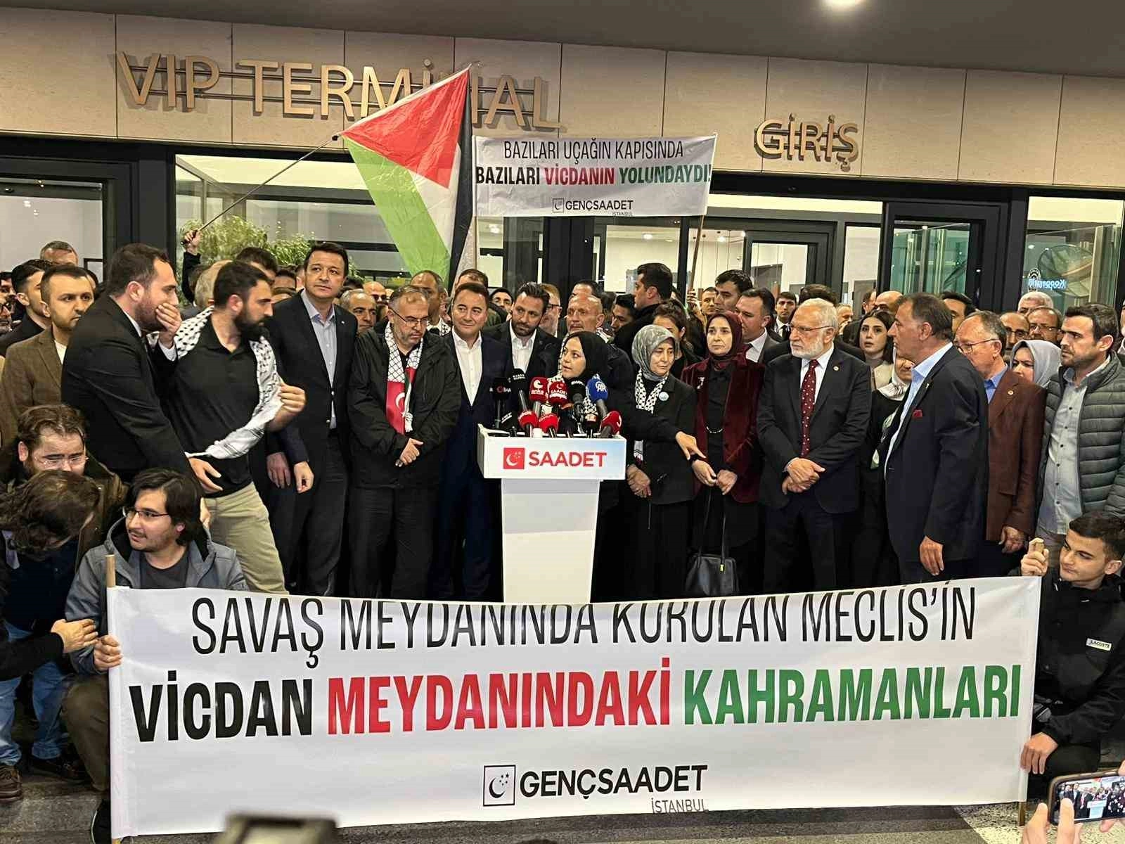 İsrail tarafından uluslararası sularda, Gazze’ye insani yardım götürmek üzere yola çıkan Vicdan Gemisi’ne yapılan saldırıda alıkonulan milletvekilleri İstanbul Havalimanı’na indi. Milletvekilleri, Saadet Partisi Genel Başkanı Mahmut Arıkan, partililer ve Filistin destekçisi vatandaşlar tarafından karşılandı.