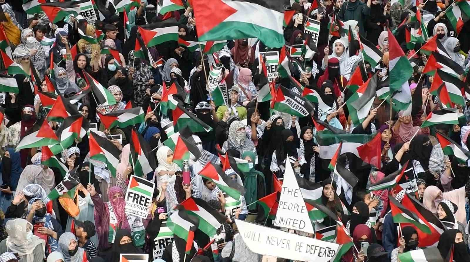 Cemaat-i İslami Partisi liderliğinde düzenlenen gösteride, ellerinde Filistin bayrakları taşıyan protestocular, Gazze Şeridi ile dayanışma içinde olduklarını ifade etti.