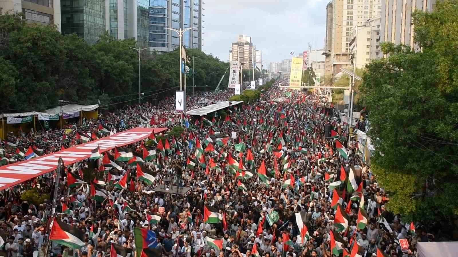 Pakistan’da binlerce kişi, ellerinde Filistin bayrakları ile Gazze Şeridi için destek gösterisi düzenledi.