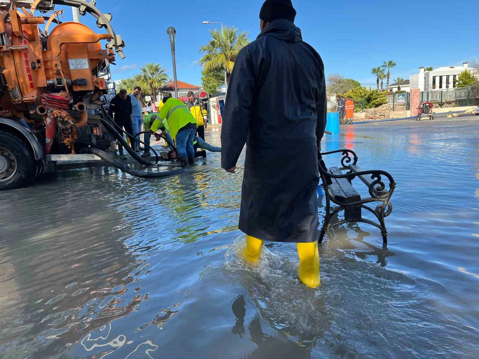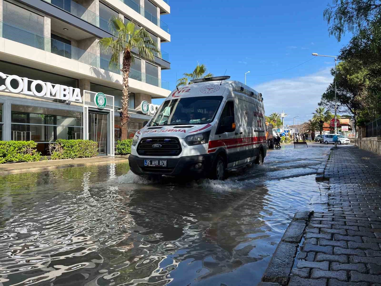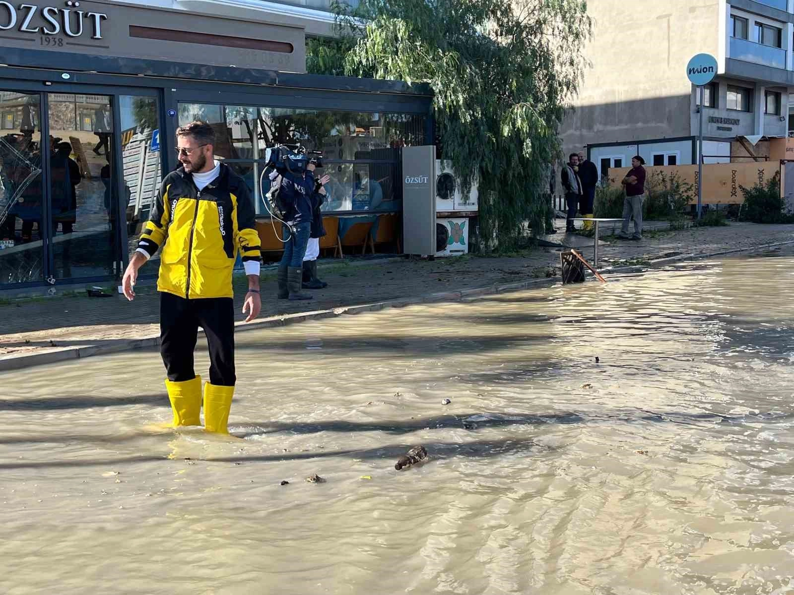 Şiddetli yağışın etkili olduğu Çeşme’de deniz seviyesinin yükselmesi ve tahliye hatlarının tıkanması nedeniyle ilçe merkezinde su baskınları yaşandı. İlçede hayat olumsuz etkilendi.