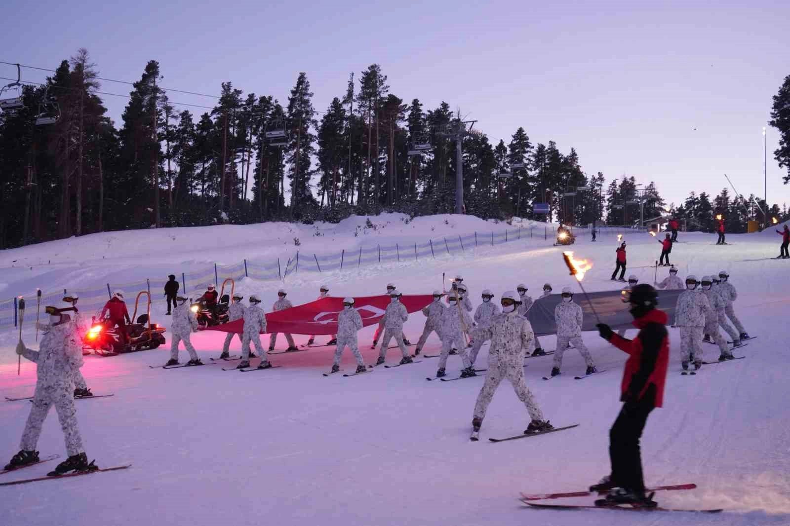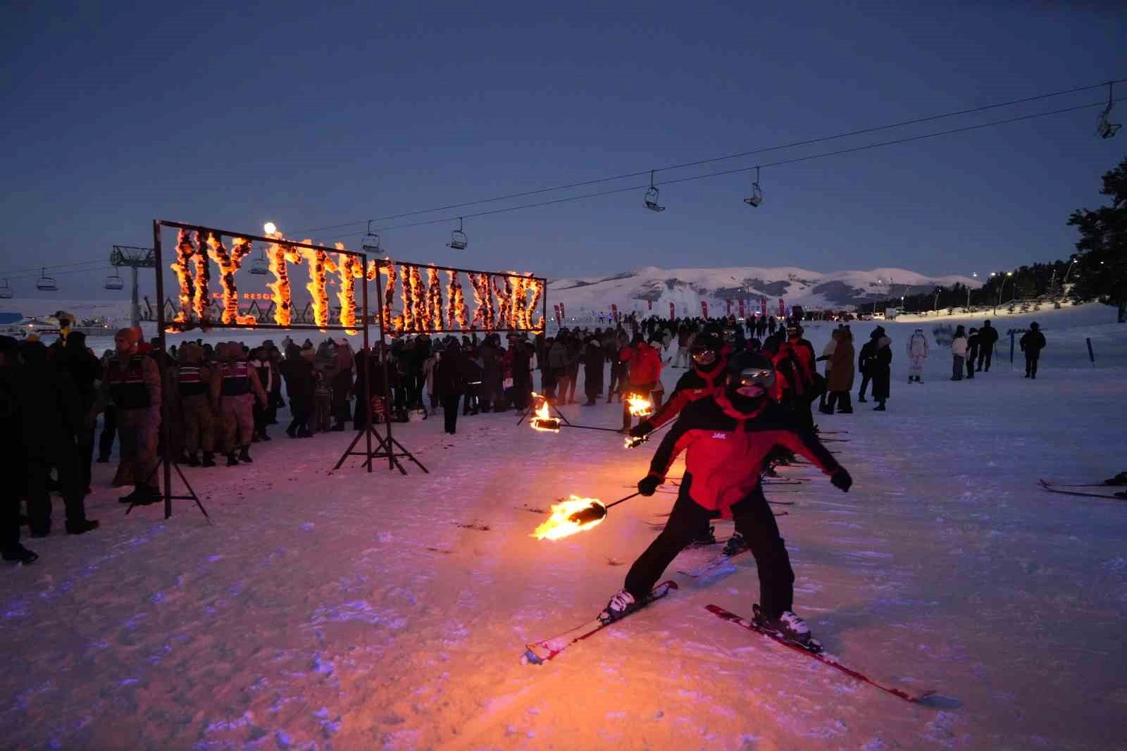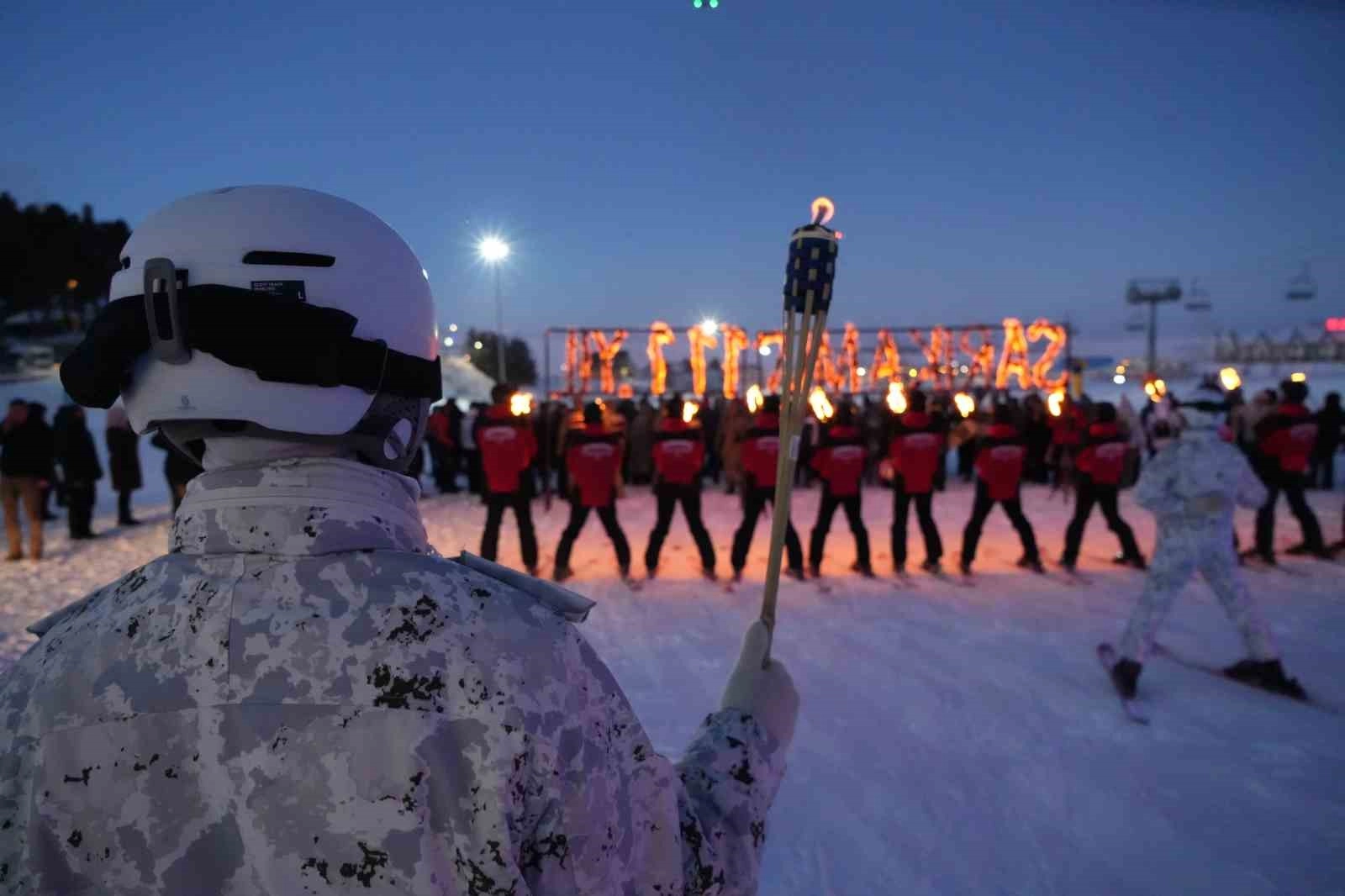 Sarıkamış’ta şehit olan askerlerin anısına kayak merkezinde meşaleli kayak gösterisi yapıldı.