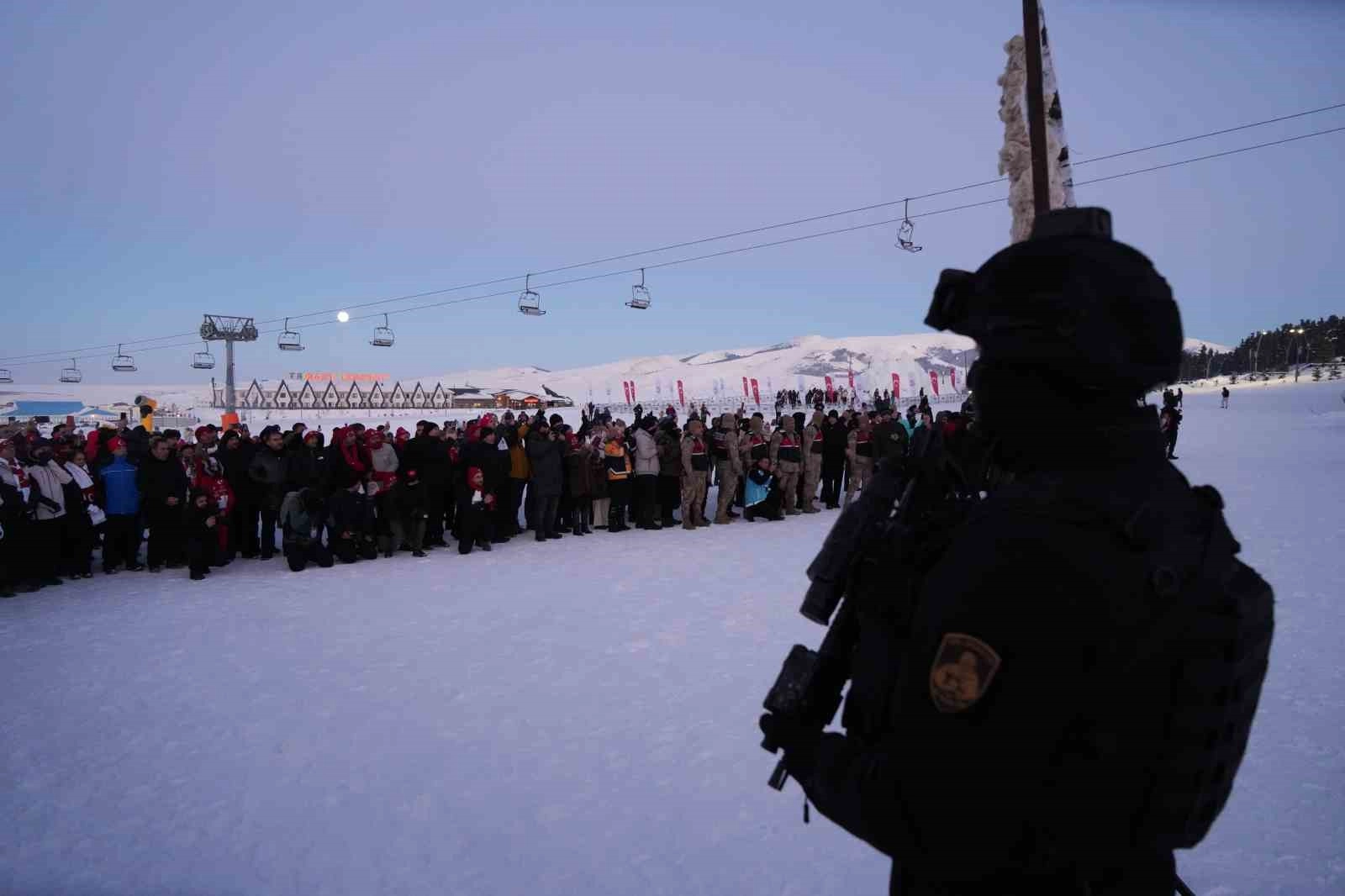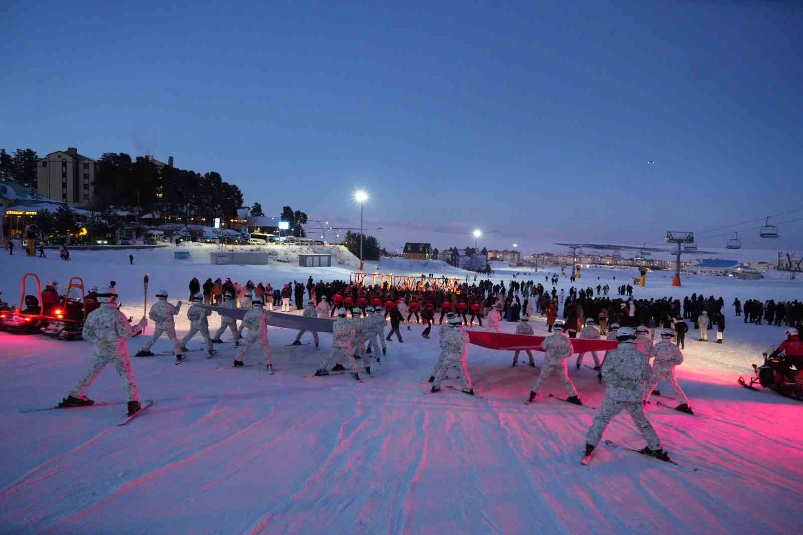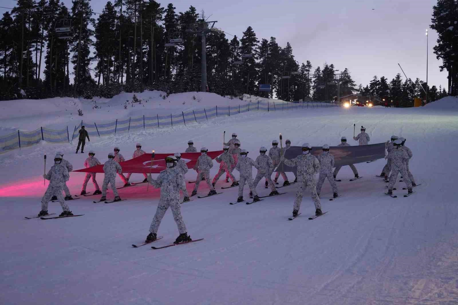 Sarıkamış’ta şehit olan askerlerin anısına kayak merkezinde meşaleli kayak gösterisi yapıldı.
