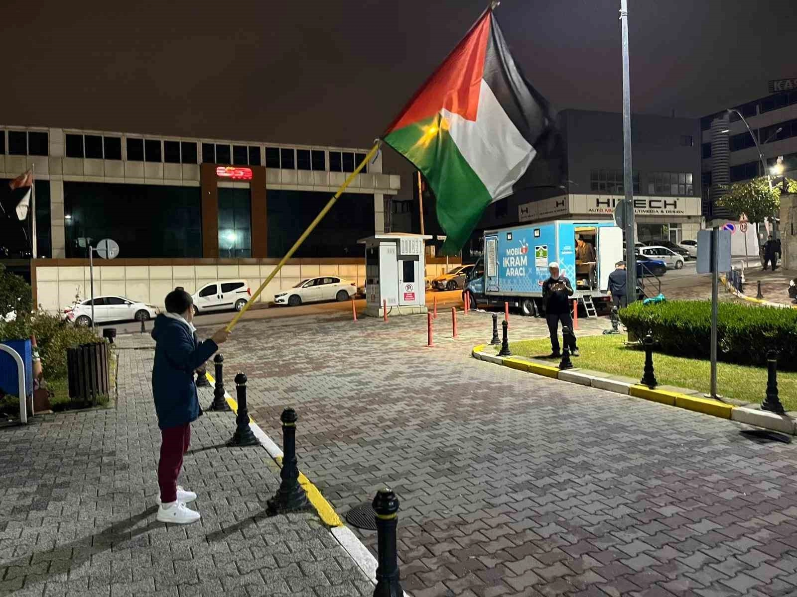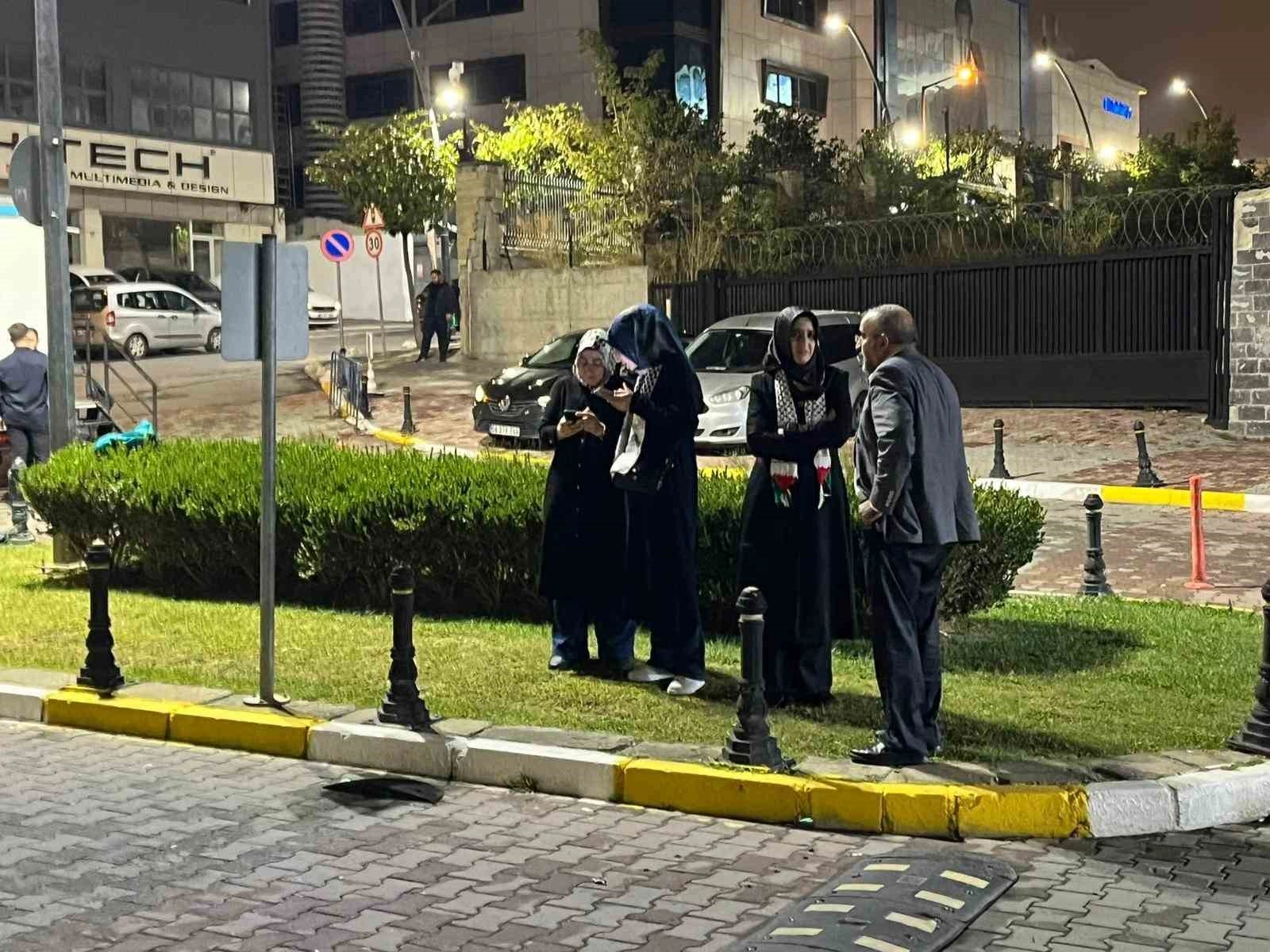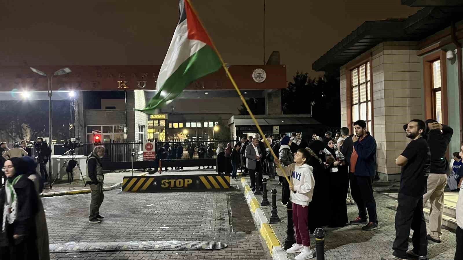 Aktivistlere destek olmak için ellerine Türk ve Filistin bayraklarıyla Adli Tıp Kurumu önünde toplanan vatandaşlar tekbir getirdi.
