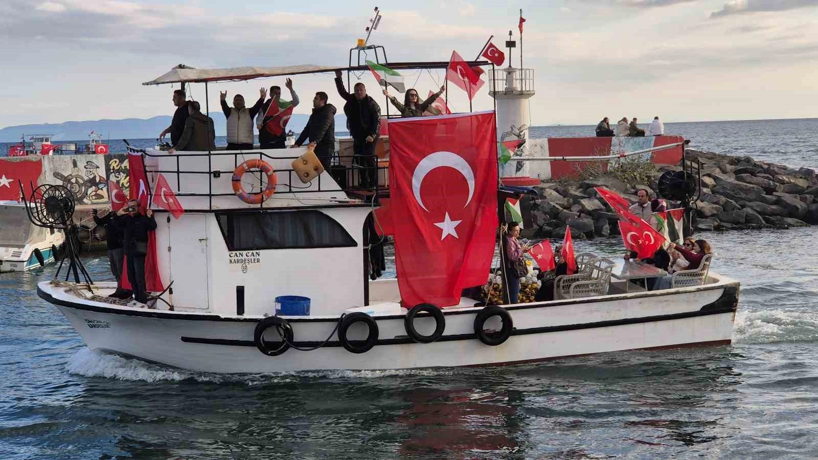 Balıkçıların oluşturduğu deniz konvoyu, sahil boyunca siren sesleri ve sloganlarla ilerleyerek Gazze’ye yönelik dayanışma mesajı verdi.