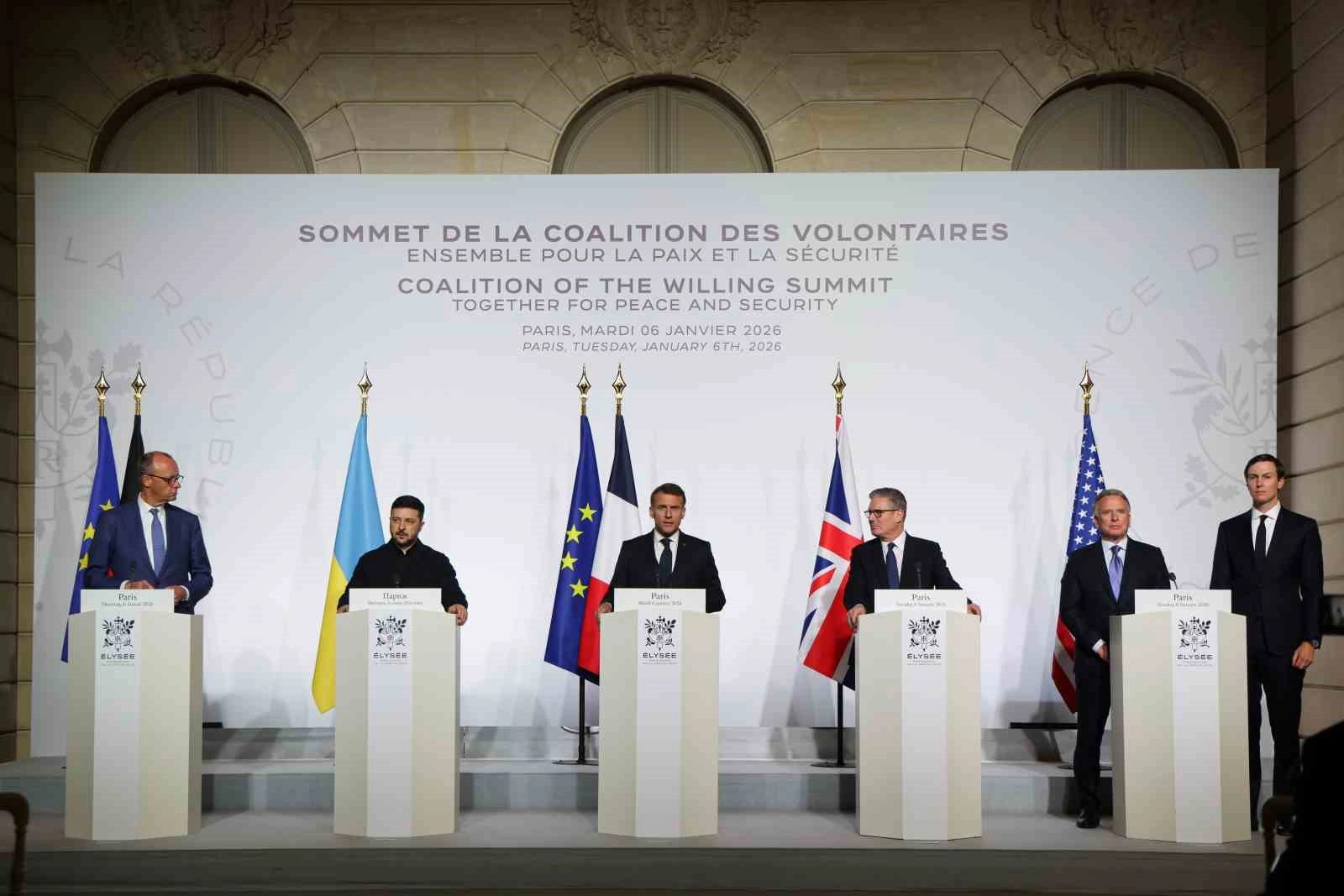 Ukrayna Devlet Başkanı Vladimir Zelenskiy, Fransa Cumhurbaşkanı Emmanuel Macron, İngiltere Başbakanı Keir Starmer, Almanya Başbakanı Friedrich Merz, ABD Başkanı Donald Trump’ın Özel Temsilcisi Steve Witkoff ve Trump’ın damadı Jared Kushner, Fransa’nın başkenti Paris’te düzenlenen Ukrayna konulu Gönüllüler Koalisyonu Liderler Zirvesi’nin ardından ortak basın toplantısı düzenledi.