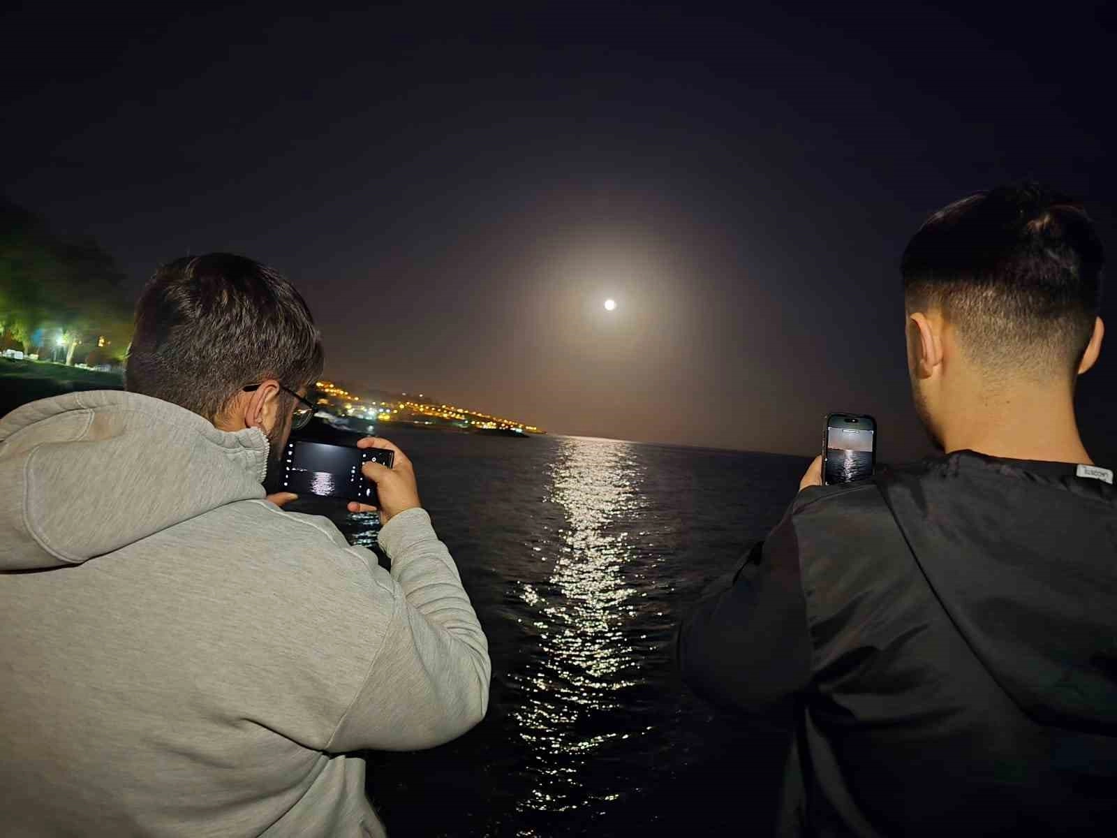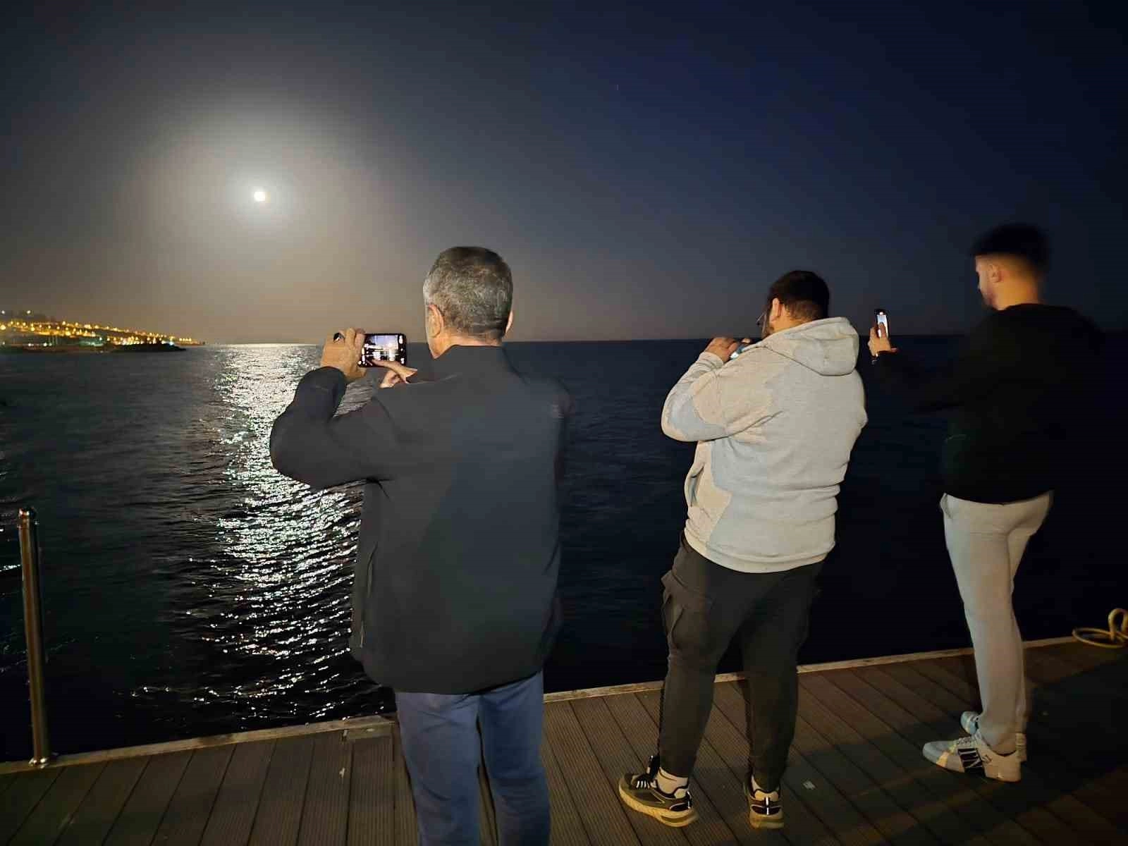 Vatandaşlar, Ahlat iskelesinde uzun süre göl üzerindeki dolunayın yansımasını izleyerek keyifli anlar yaşadı.