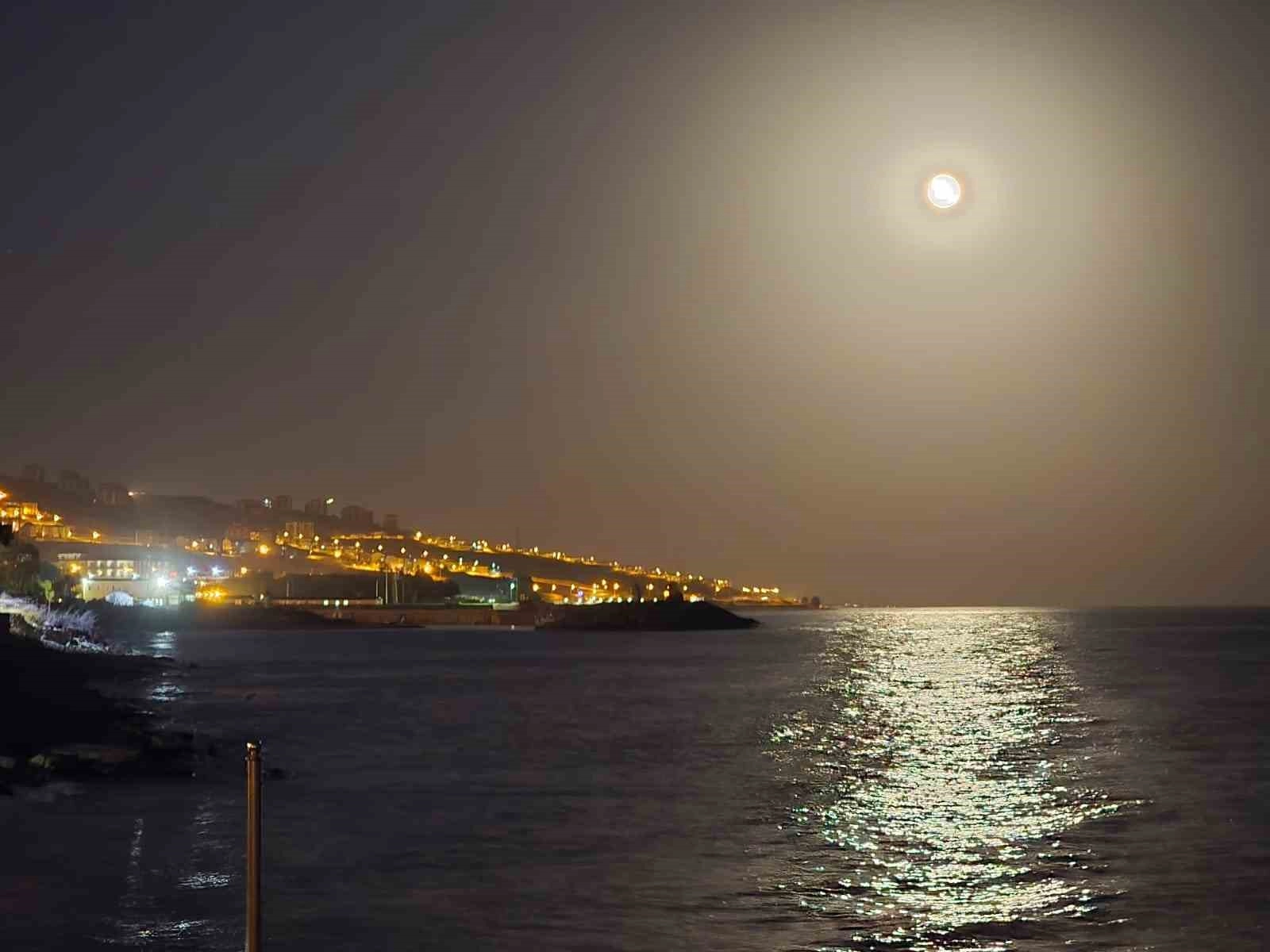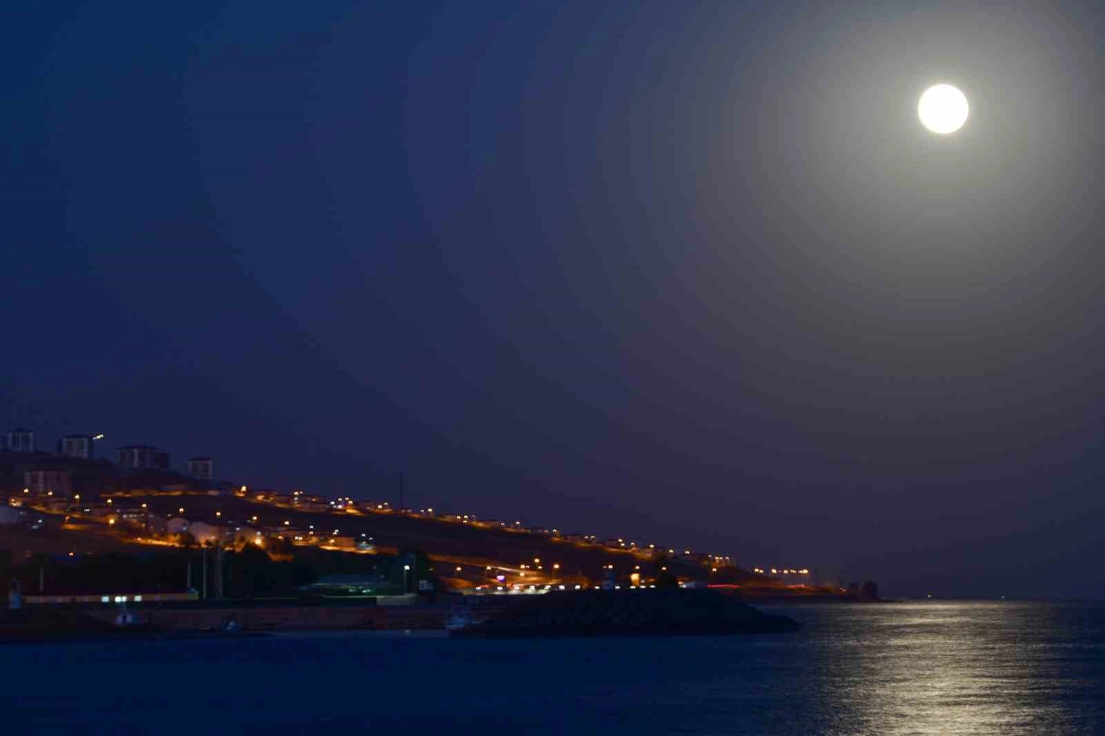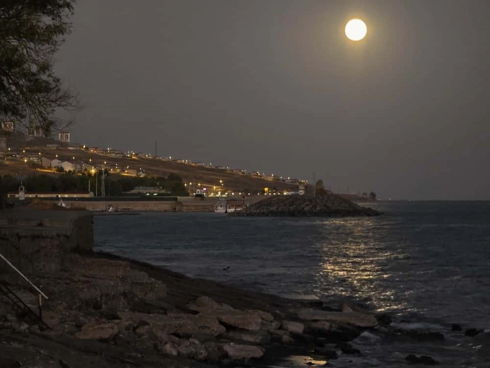 Gökyüzünde tüm ihtişamıyla yükselen dolunay, Van Gölü’ne yansıyarak eşsiz bir ışık oyununa dönüştü.