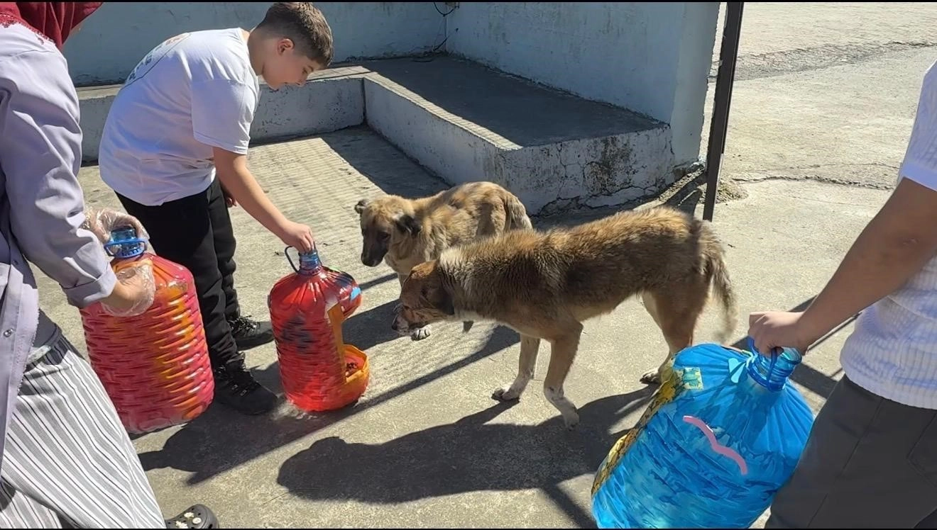 Yemeklerden arta kalan yiyecekler hazırlanan kaplarda toplanarak okul çevresindeki belirli noktalara bırakılırken, zaman zaman öğrenciler sokak hayvanlarını kendi elleriyle de besliyor.